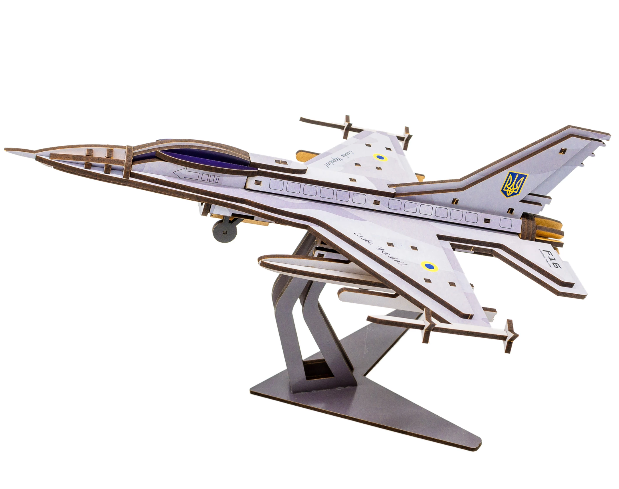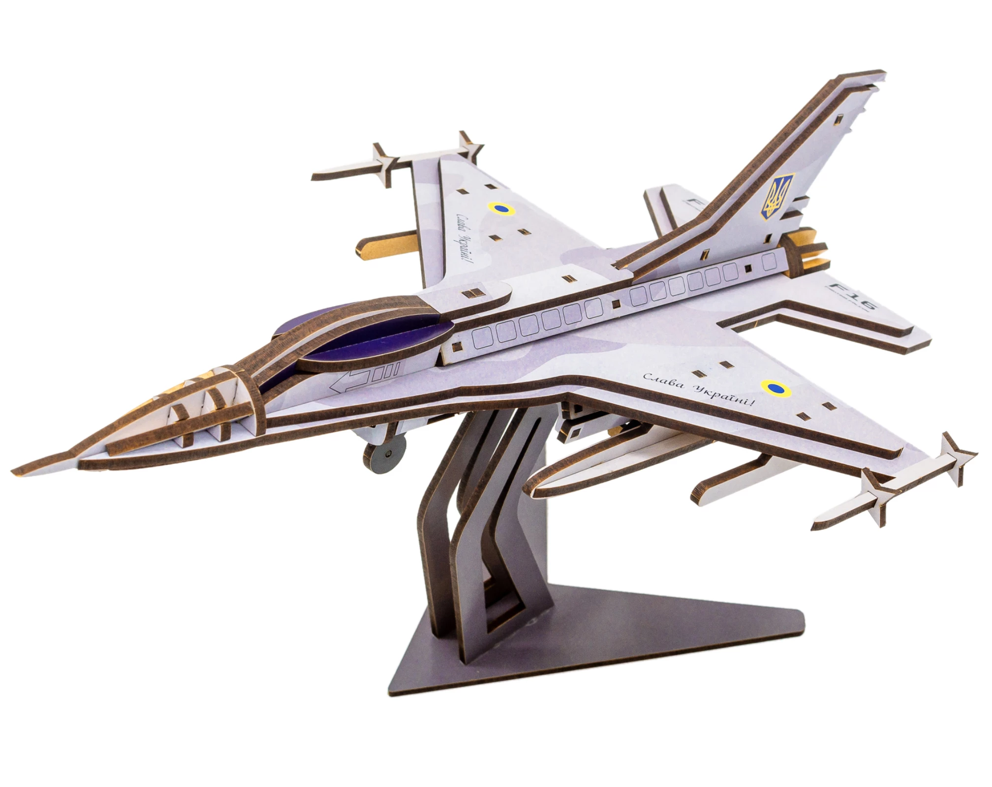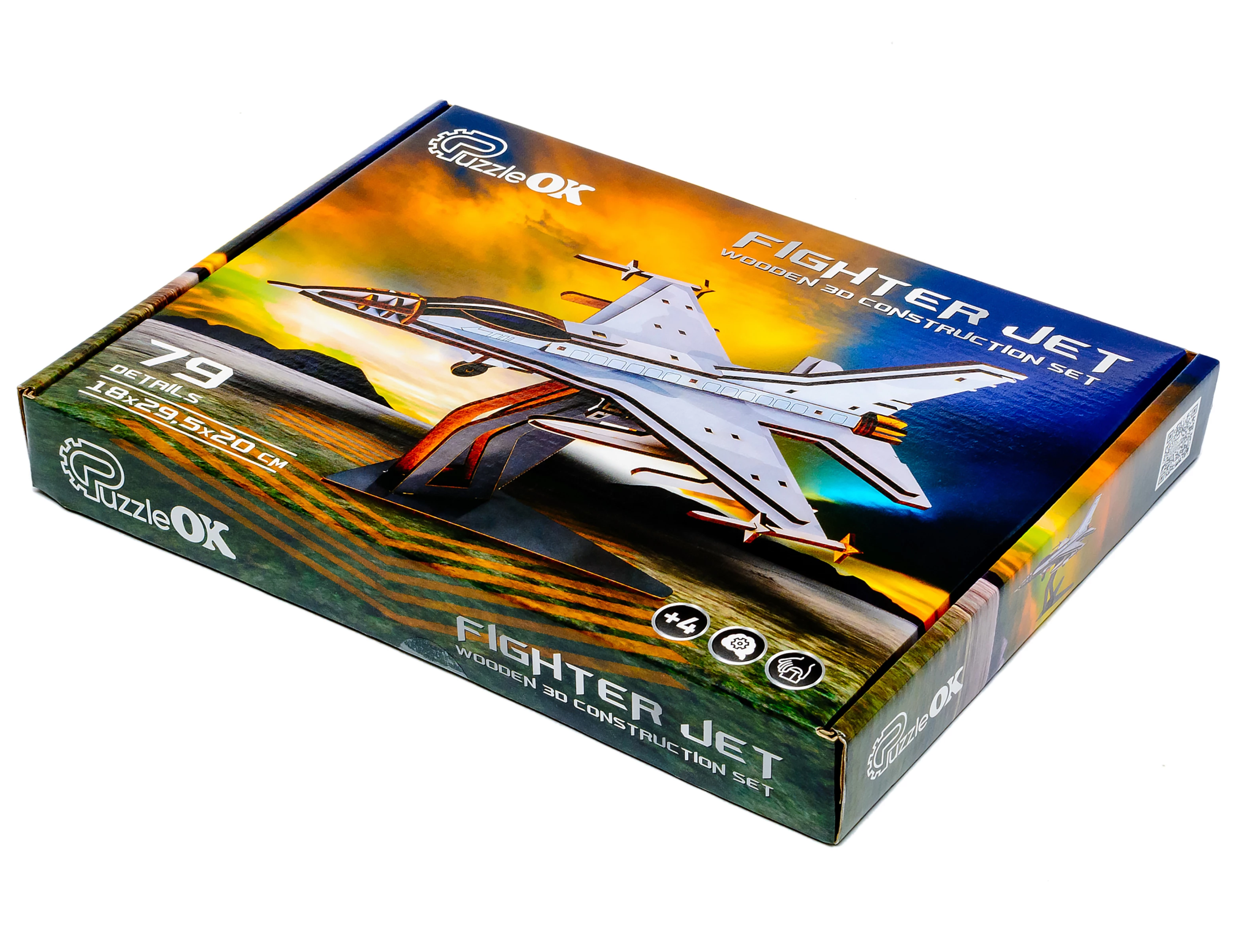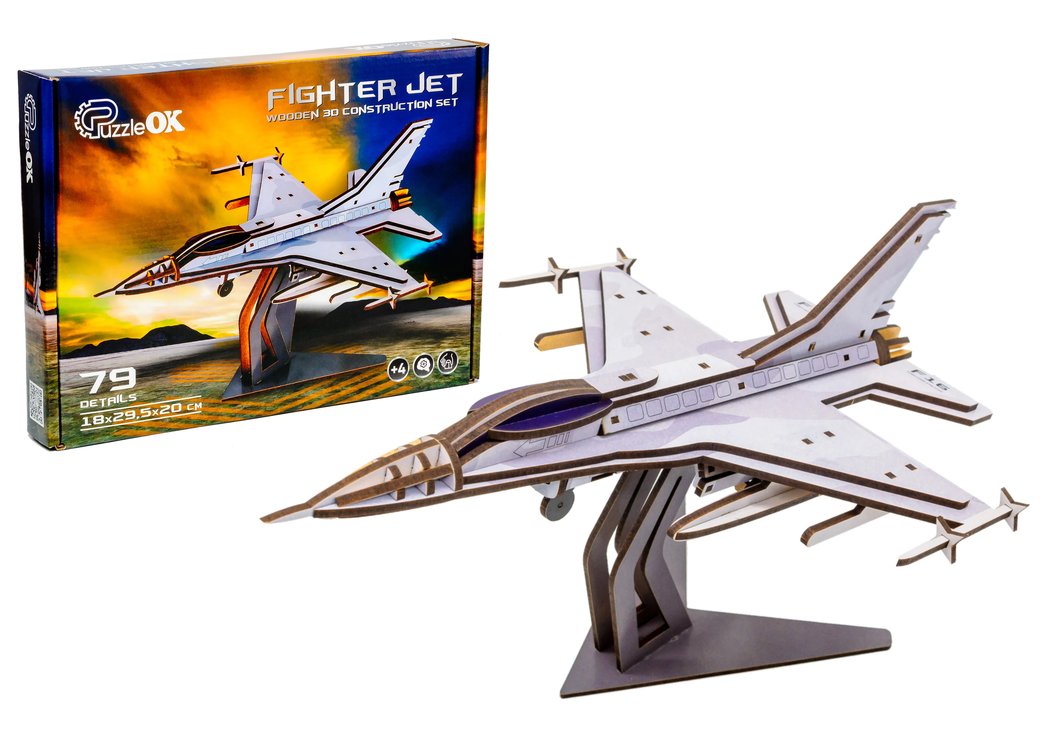 Этот деревянный 3D-конструктор от торговой марки PuzzleOk предназначен для сборки детализированной модели истребителя F-16. Представленный набор состоит из 79 элементов, изготовленных из высококачественной древесины. В комплект входит специальная подставка для размещения готовой модели на горизонтальных поверхностях.