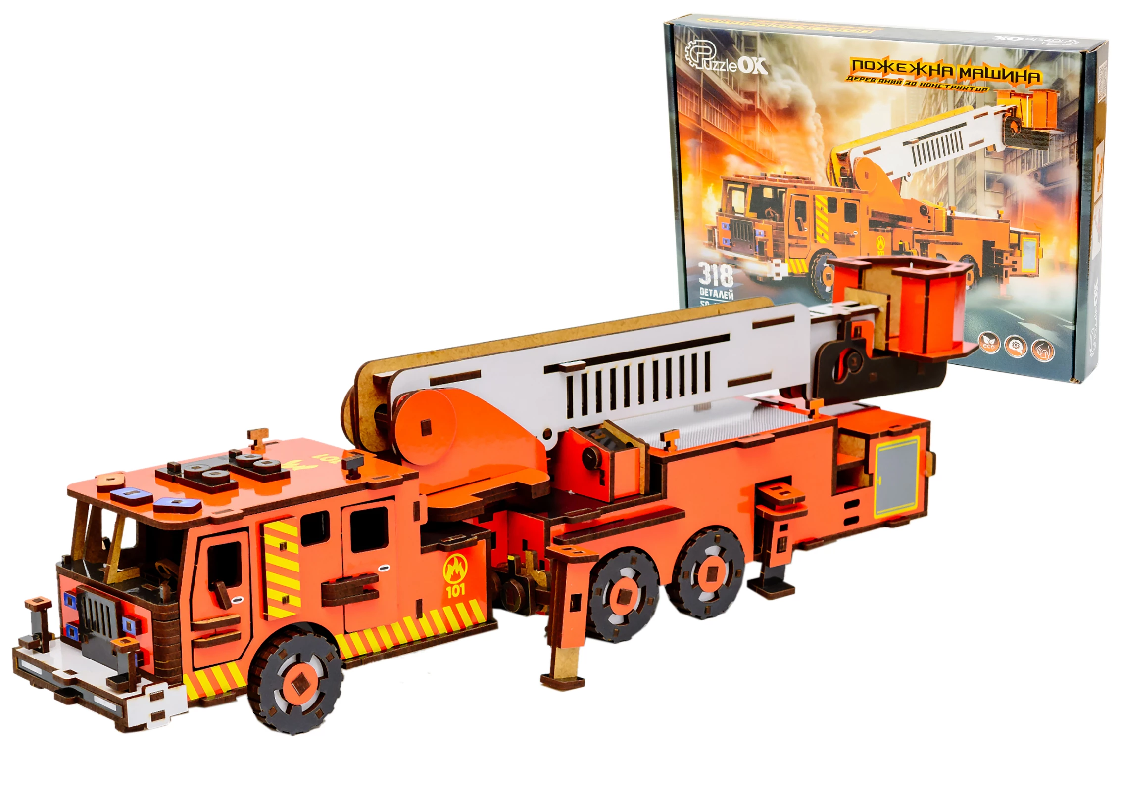 Видео Деревянный 3D-конструктор Пожарная машина (318 деталей) от PuzzleOk
