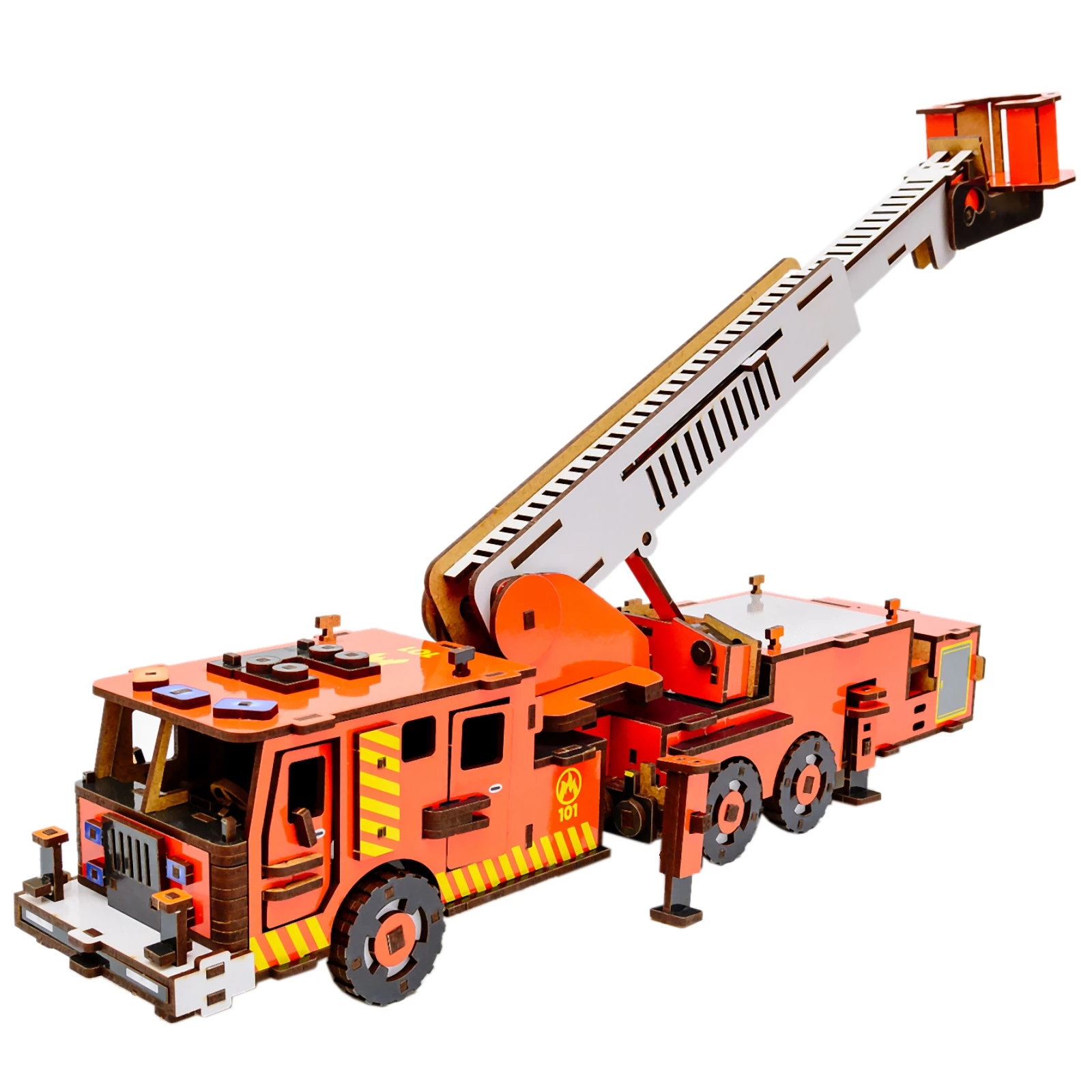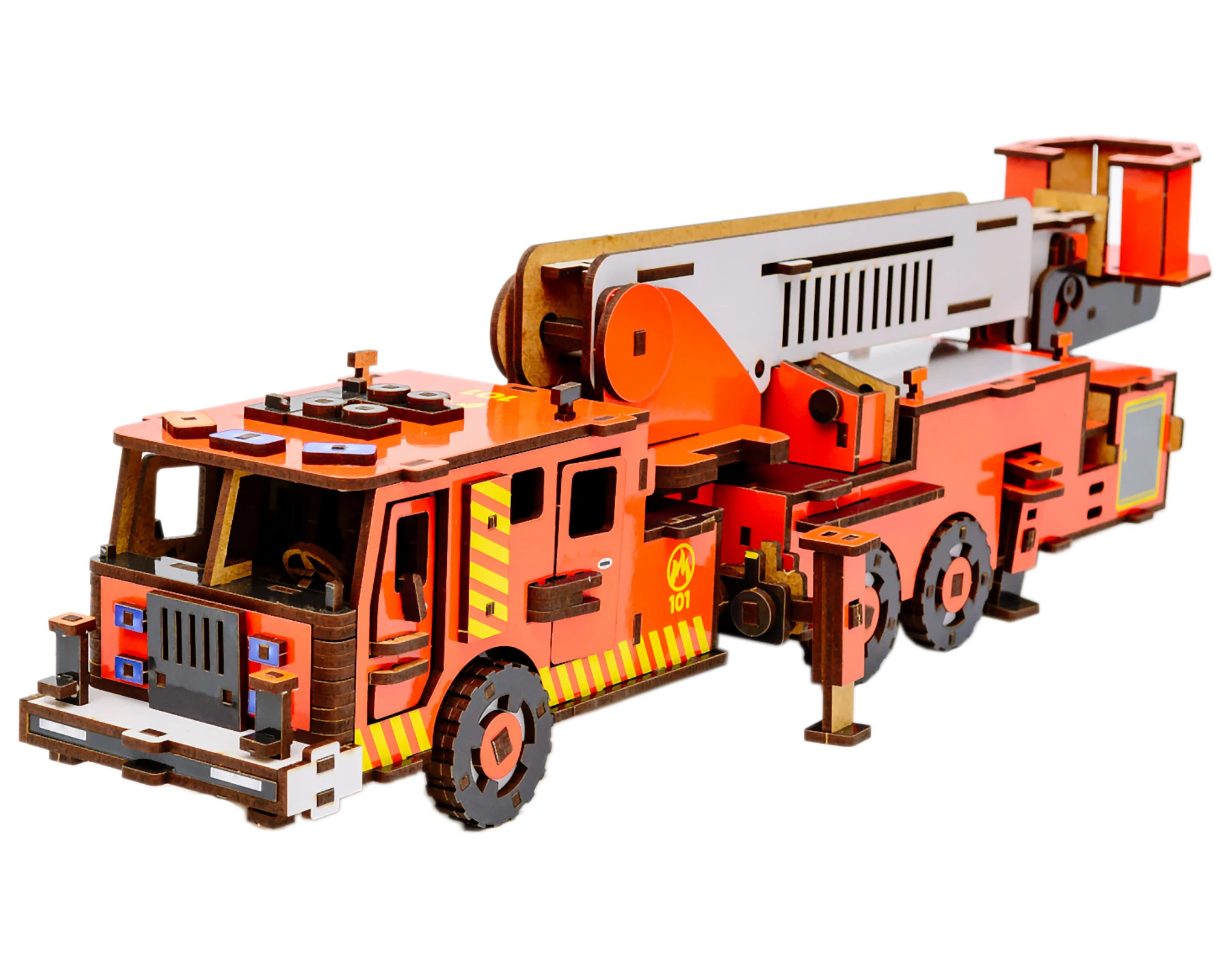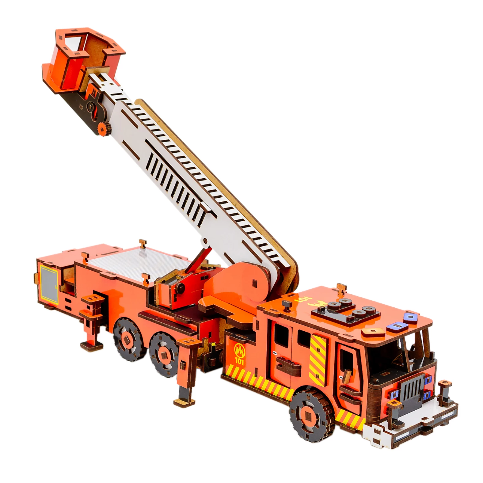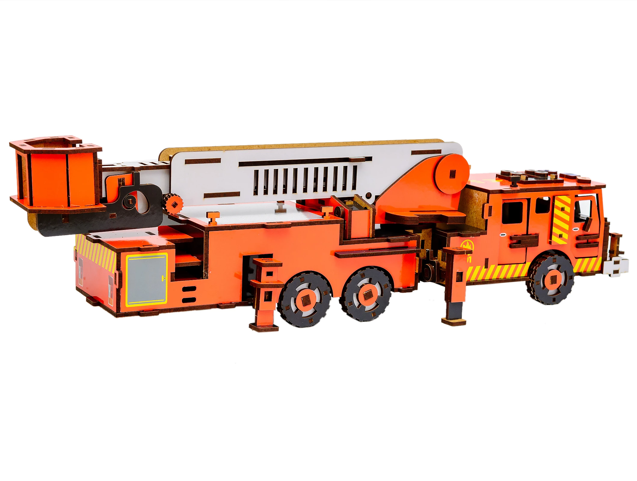 Деревянный 3D-конструктор позволяет собрать детализированную модель пожарной машины с подвижными элементами. Набор состоит из 318 деталей, изготовленных из экологически чистого древесного материала. Готовая модель оснащена выдвижной телескопической лестницей, поворотной платформой и дополнительными боковыми опорами. Конструкция включает имитацию кабины управления, детализированные колеса и элементы кузова, соответствующие реальному спецтранспорту.