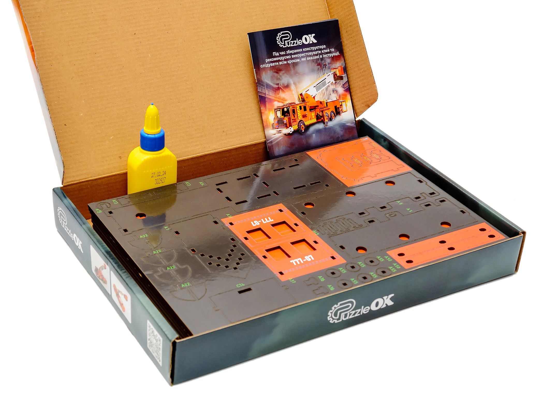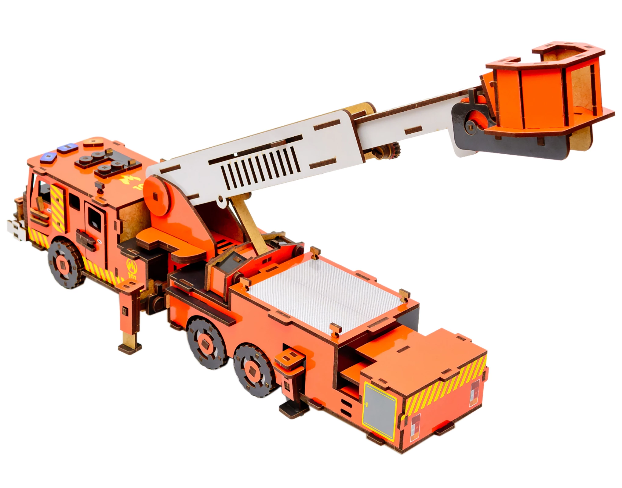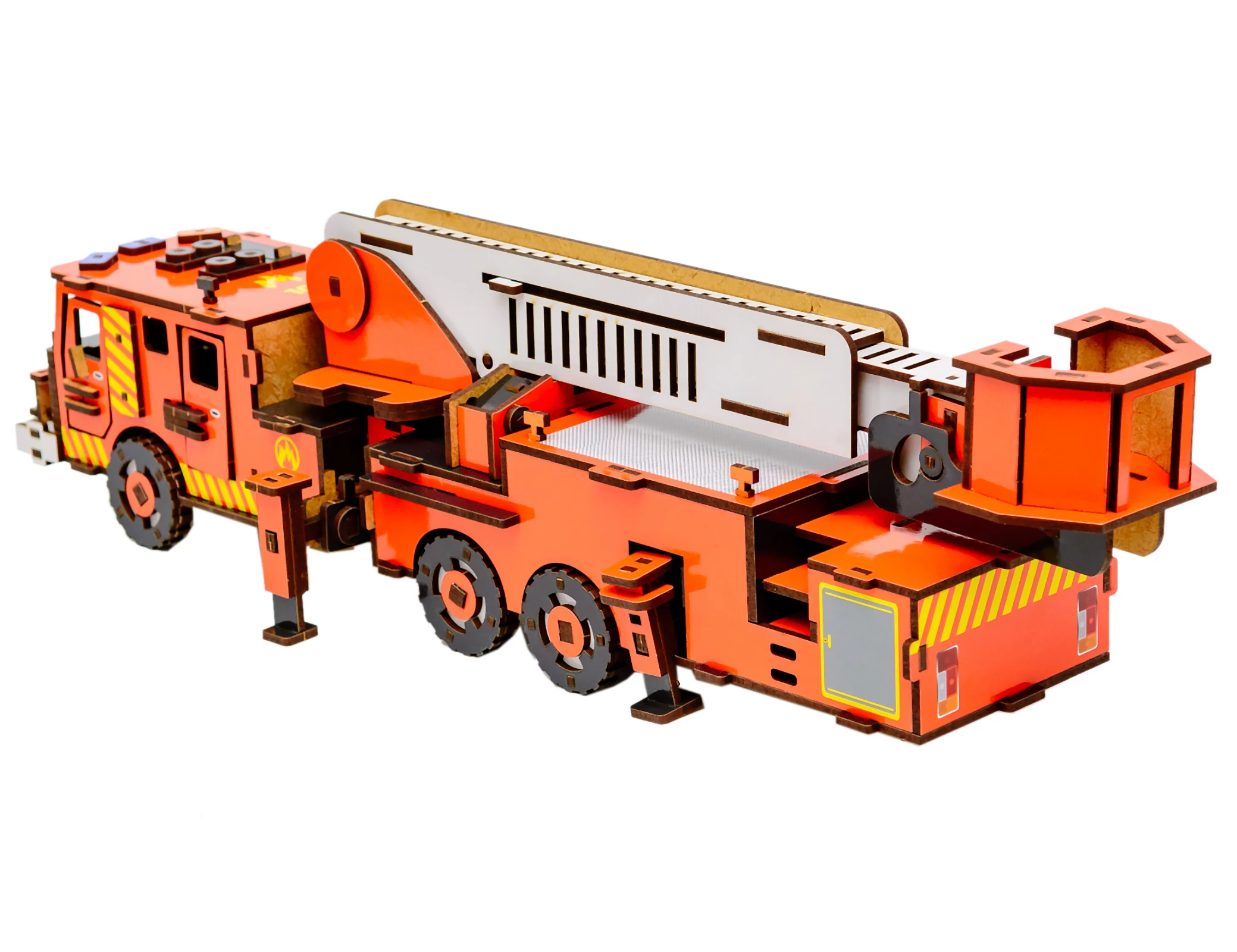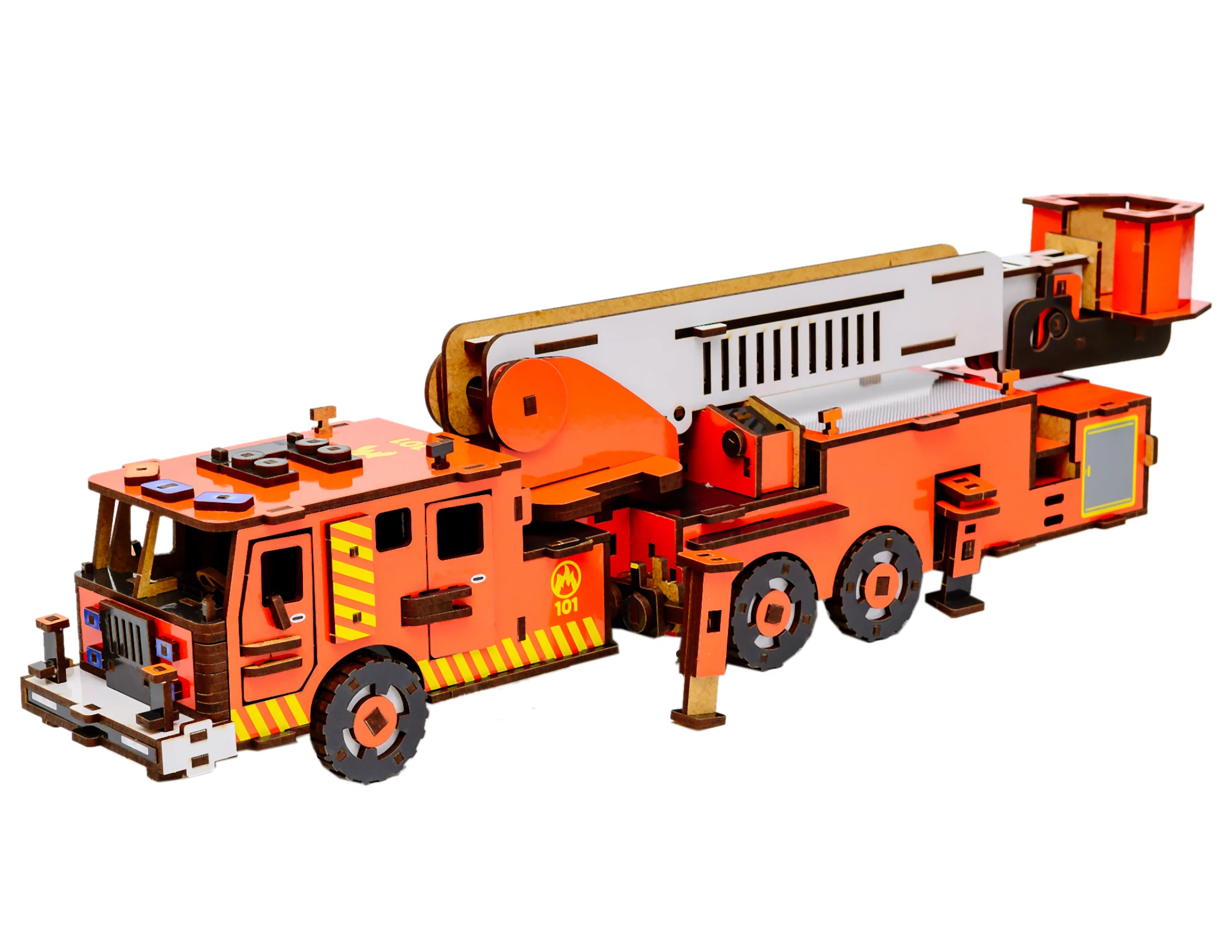 Деревянный 3D-конструктор позволяет собрать детализированную модель пожарной машины с подвижными элементами. Набор состоит из 318 деталей, изготовленных из экологически чистого древесного материала. Готовая модель оснащена выдвижной телескопической лестницей, поворотной платформой и дополнительными боковыми опорами. Конструкция включает имитацию кабины управления, детализированные колеса и элементы кузова, соответствующие реальному спецтранспорту.