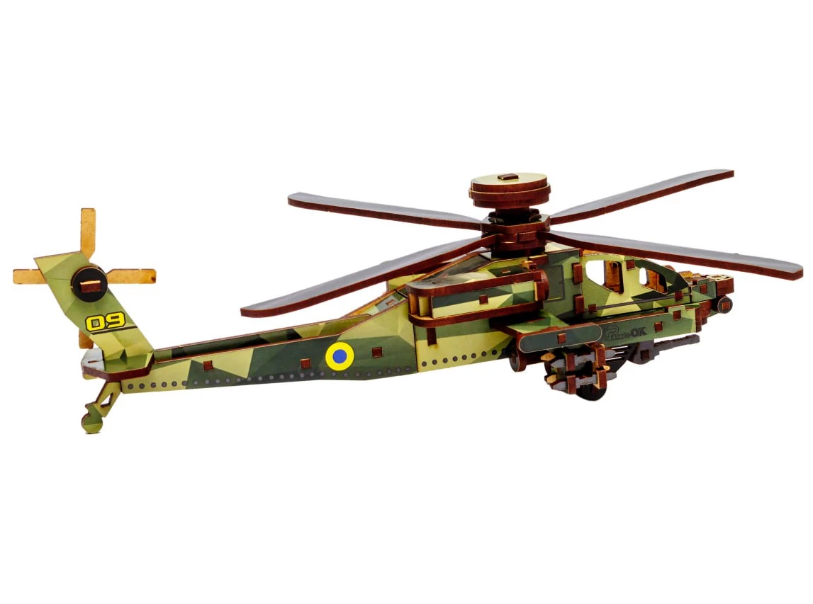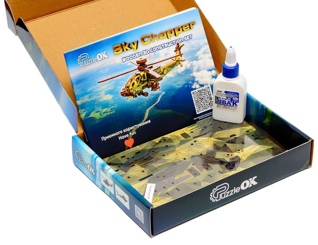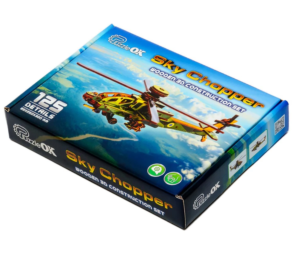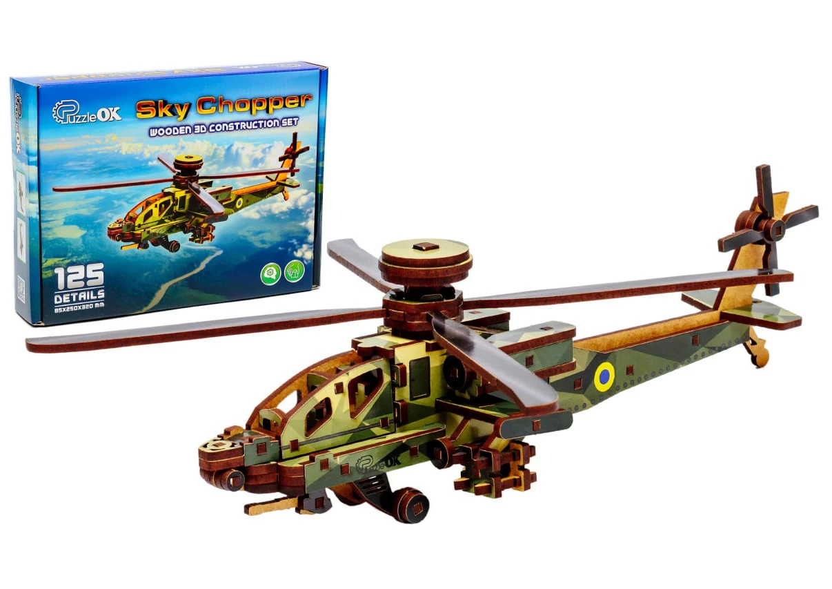 Деревянный 3D-конструктор Sky Chopper от торговой марки PuzzleOk позволяет собрать детализированную копию военного вертолета из 125 элементов. Все составляющие набора изготовлены из качественной древесной плиты и предварительно окрашены в камуфляжные цвета. Детали точно и надежно соединяются друг с другом. В собранном виде модель имеет размеры 8,5 x 25 x 32 см. Лопасти и рулевые винты у вертолета подвижные.