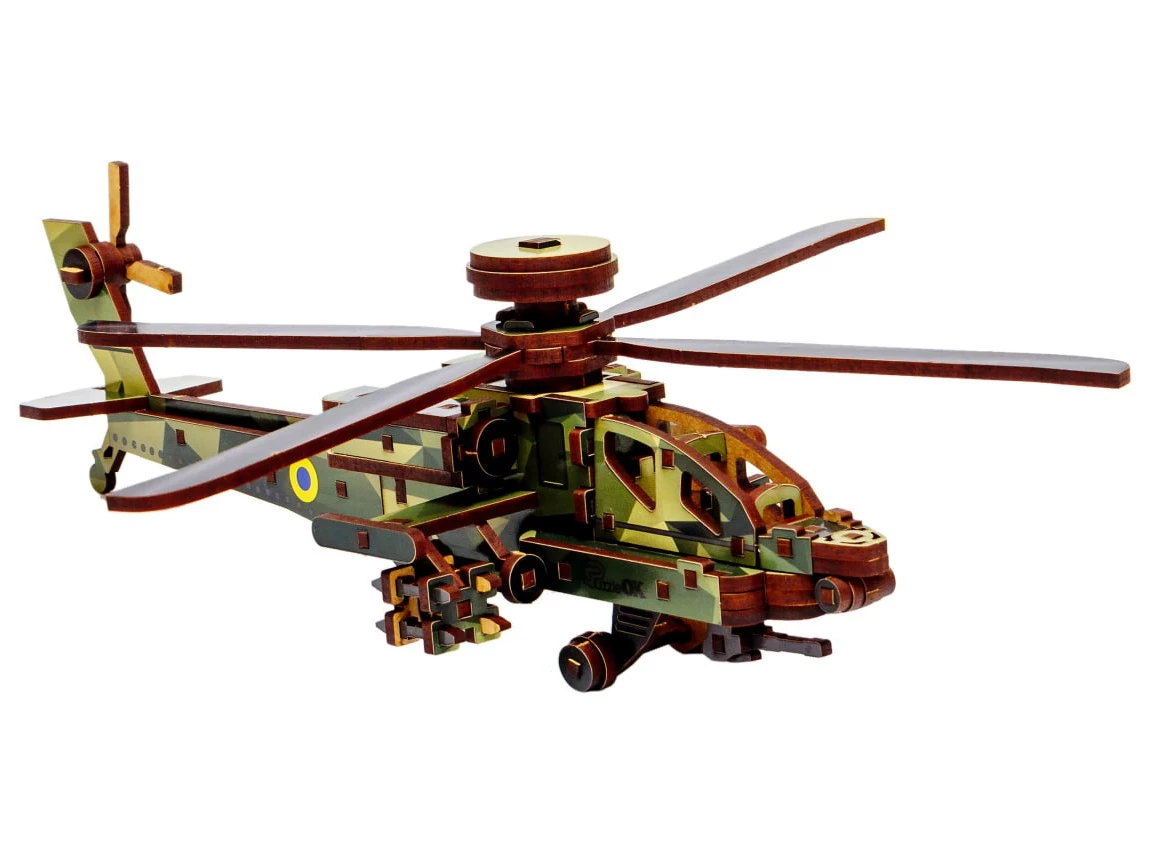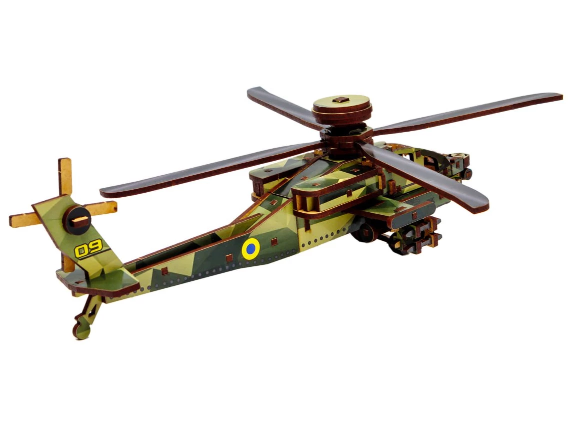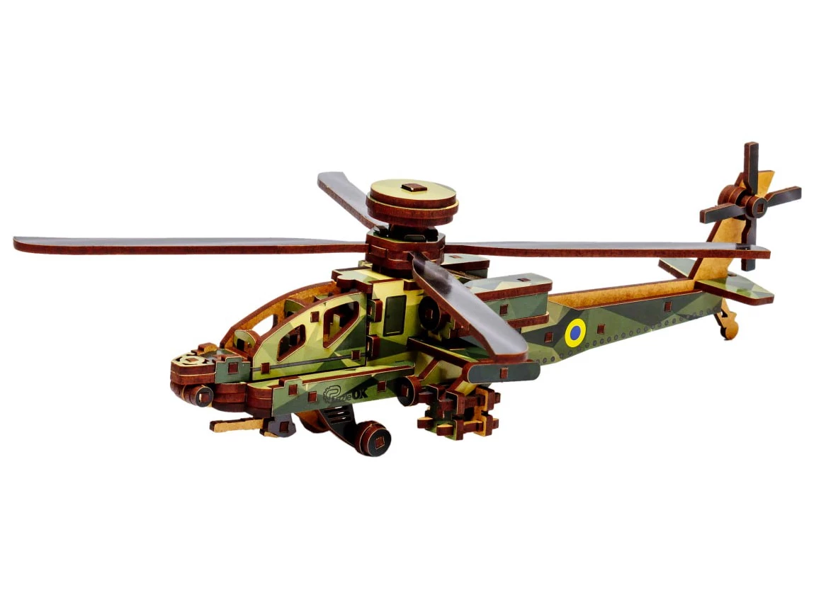 Деревянный 3D-конструктор Sky Chopper от торговой марки PuzzleOk позволяет собрать детализированную копию военного вертолета из 125 элементов. Все составляющие набора изготовлены из качественной древесной плиты и предварительно окрашены в камуфляжные цвета. Детали точно и надежно соединяются друг с другом. В собранном виде модель имеет размеры 8,5 x 25 x 32 см. Лопасти и рулевые винты у вертолета подвижные.