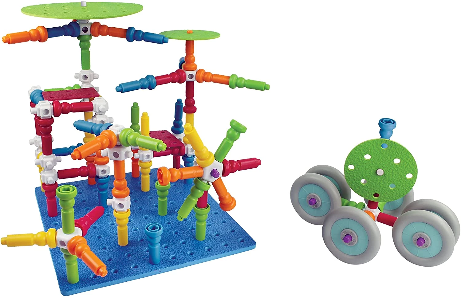 Это классические колышки входят в большой набор для строительства 3D-конструкции. Яркие цвета и приятные на ощупь детали - понравятся всем малышам. Набор включает в себя достаточно колышек, разъемов и колес для создания нескольких творений одновременно.