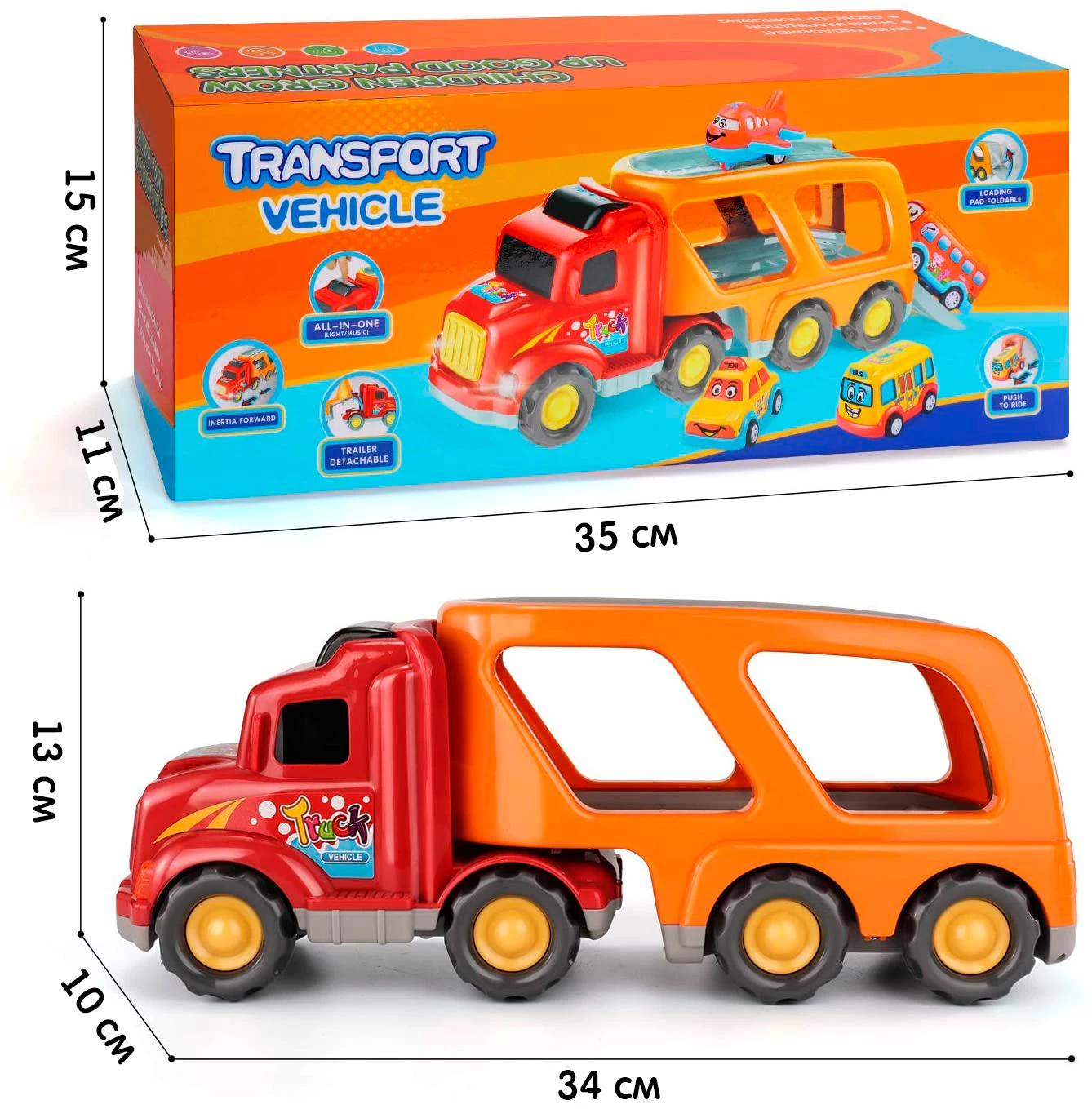 Размер большого грузовика 35х11х15 см.