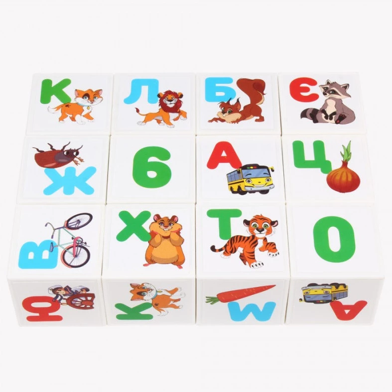представляем вашему вниманию отличный набор, который поможет детям выучить украинский алфавит и познакомиться с основами арифметики в веселой и интерактивной форме. Набор включает в себя 12 кубиков с буквами и цифрами. На каждой грани кубика напечатана буква и изображен предмет, название которого начинается на эту букву или цифра и соответствующий ей рисунок.