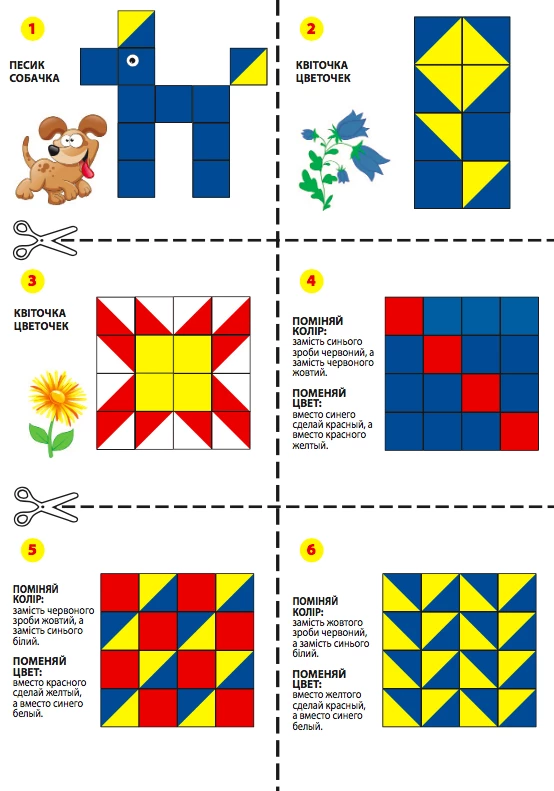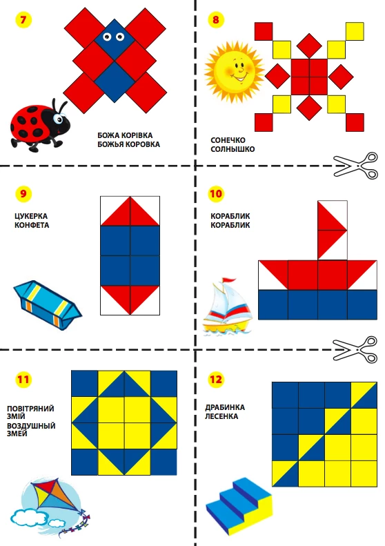 Задания в альбоме идут в порядке возрастания сложности, поэтому делать их нужно по порядку. Листы необходимо разрезать по пунктирным линиям, для удобства использования.