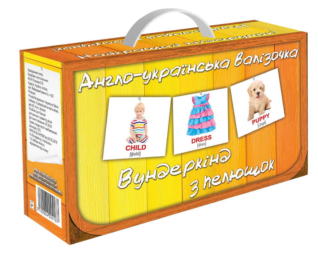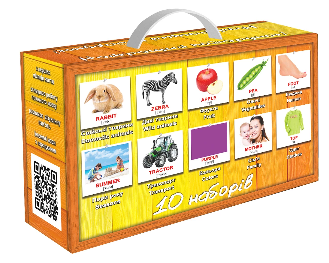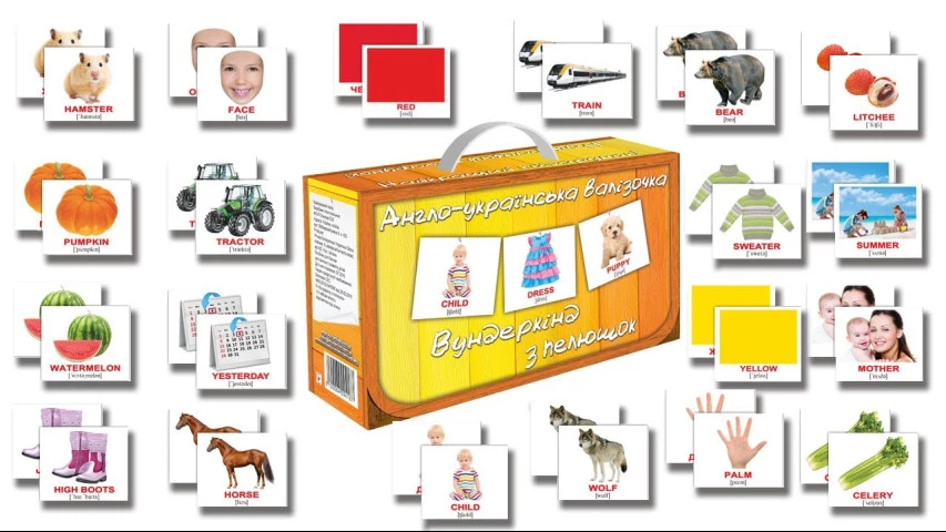 Карточки Домана пользуются огромным успехом при изучении иностранных языков, и это не случайно — они работают! Вам не нужны специальные условия. Двуязычные карточки из плотного картона (8 x 10 см) идеально подходят для занятий где угодно: дома, в дороге, на отдыхе, с детьми любого возраста. Вы можете начать прямо сейчас с компактным подарочным набором «Англо-украинский чемоданчик», который включает в себя 400 карточек по десяти важным тематикам.