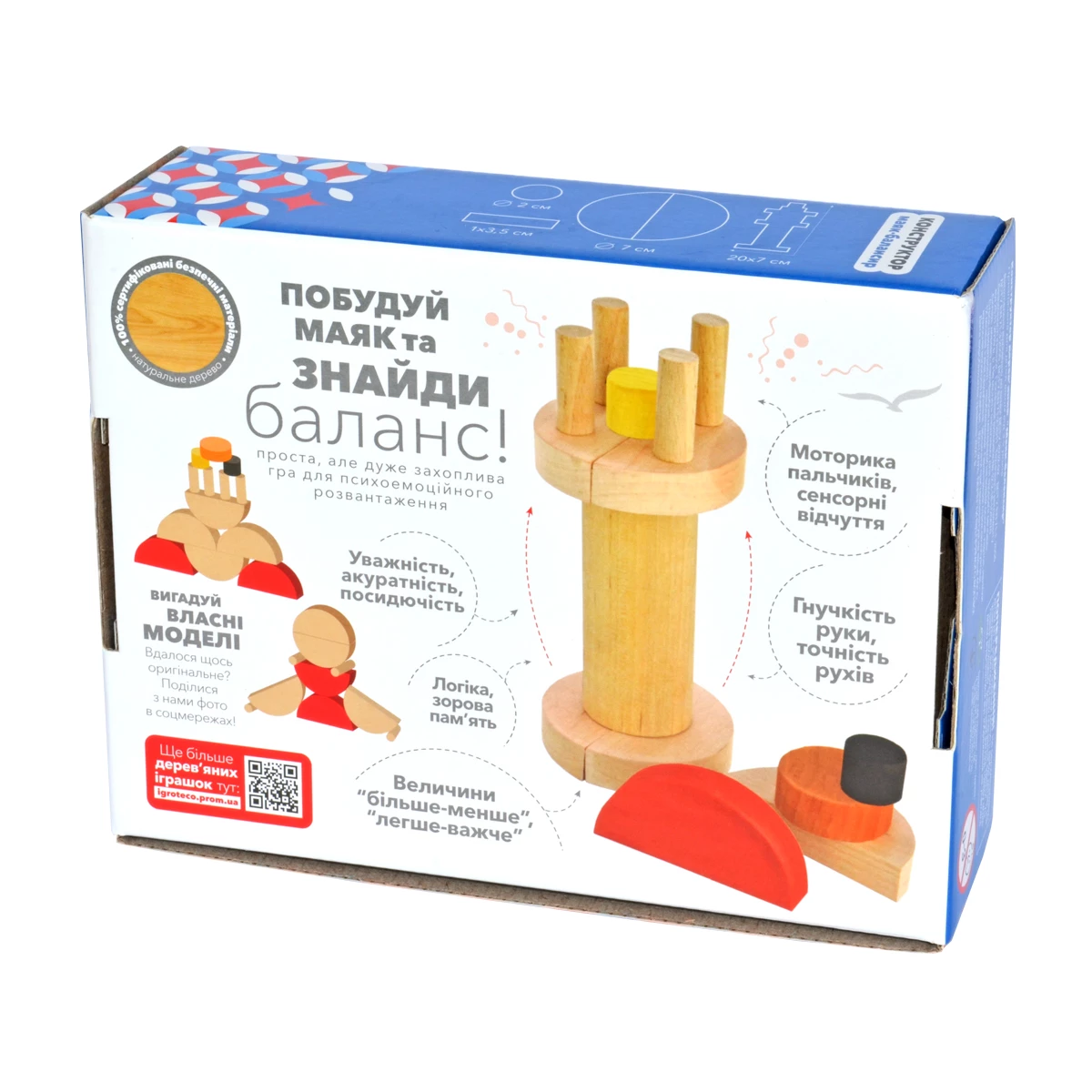 Игровой набор Маяк — замечательная игрушка, которая придется по вкусу малышам в возрасте от 3-х лет. Цель — выложить элементы данного конструктора друг на друга. При этом надо следить, чтобы конструкция не рухнула. Чтобы соорудить маяк, игрок должен проявить выдержку, настойчивость, аккуратность и терпение.
