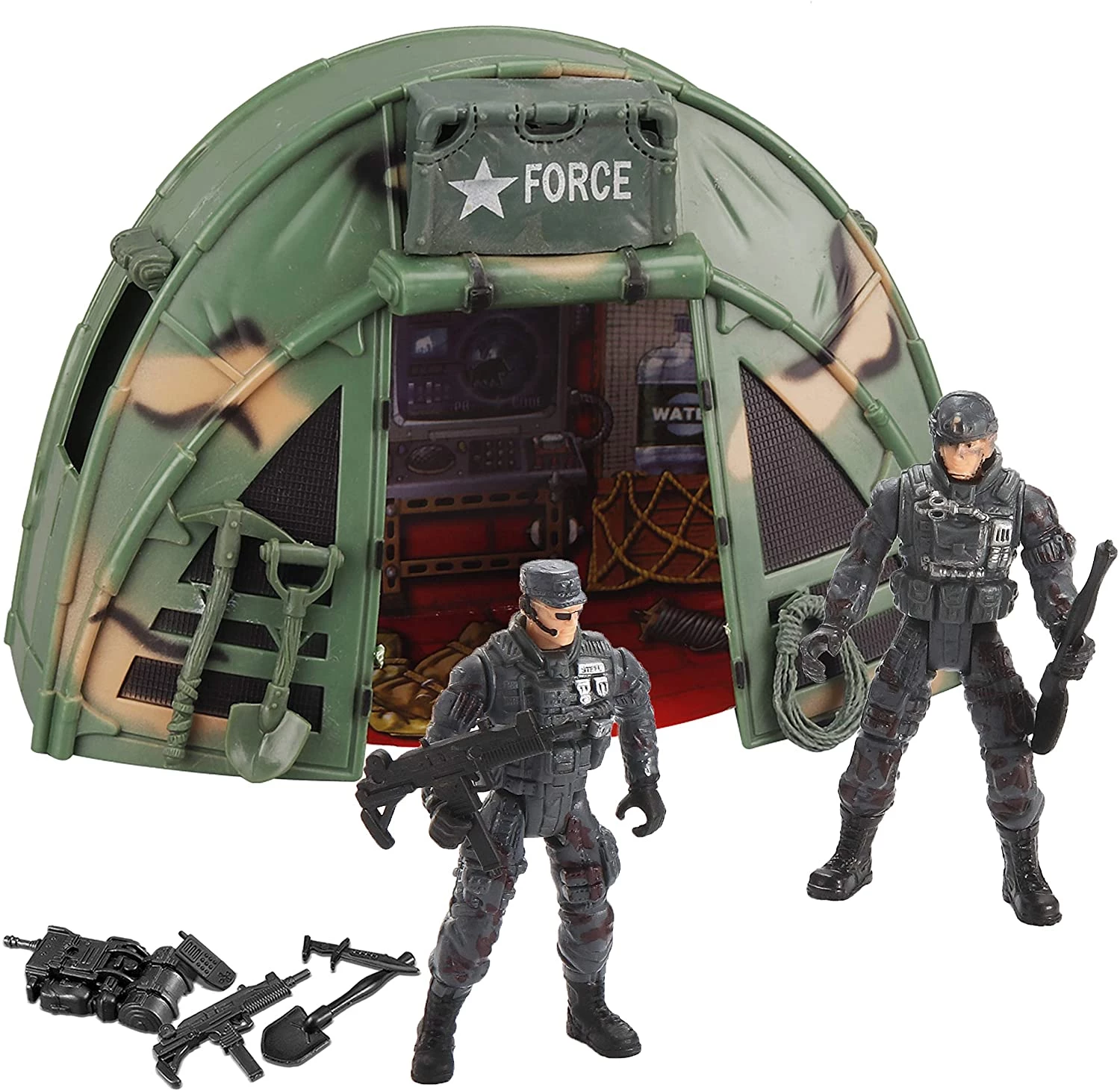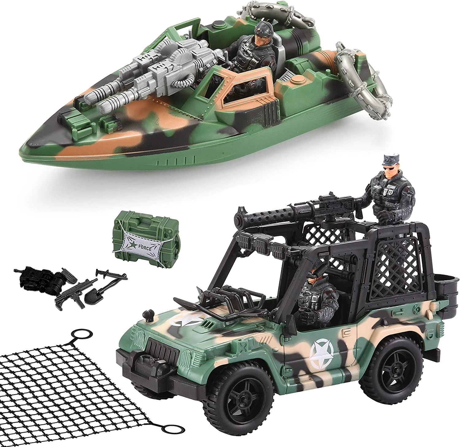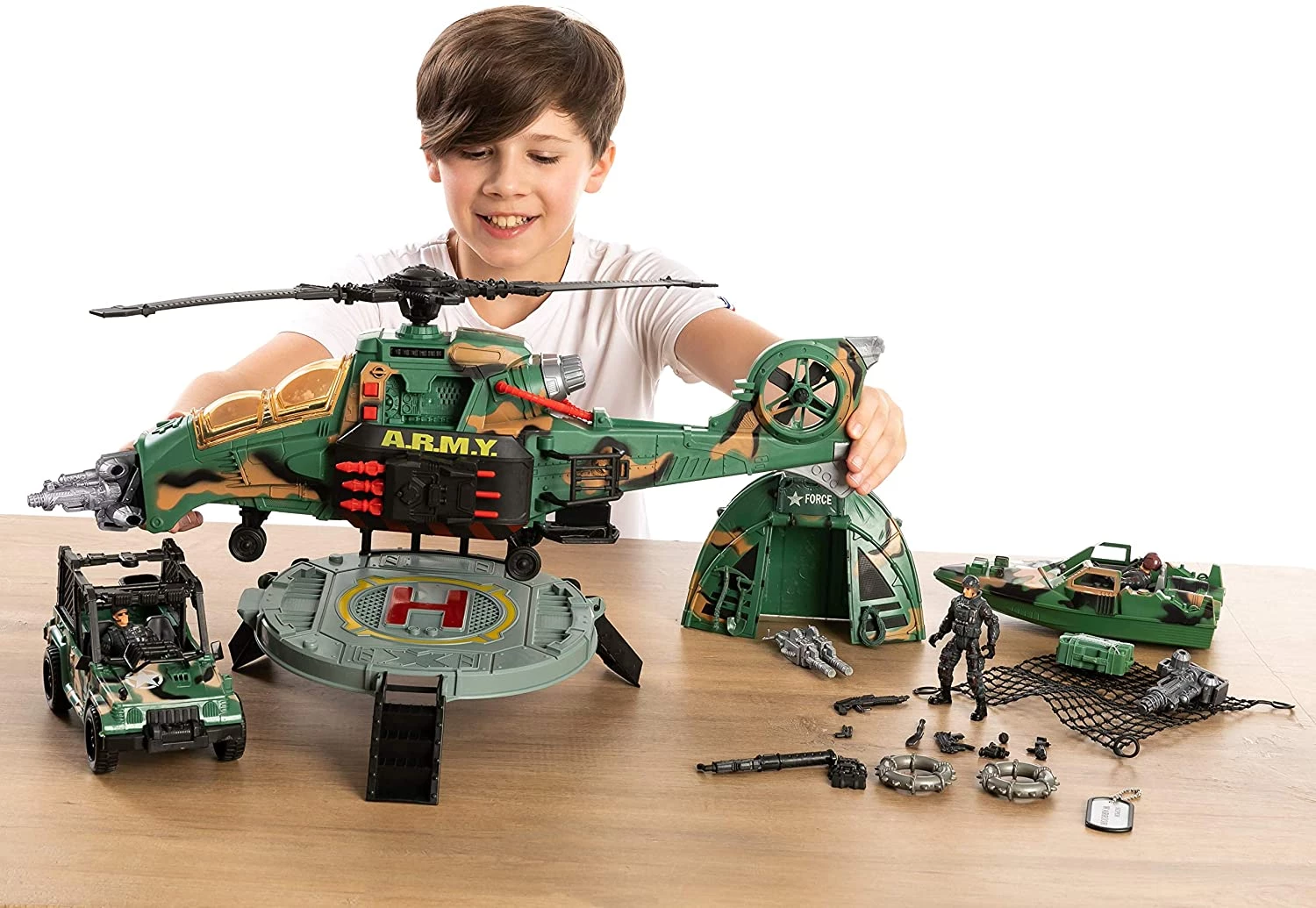 Большой боевой вертолет вмещает в себя множество маленьких игрушек и съемные ракеты. Издает разные звуки и имеет множество движущихся деталей. Подсветка и разные звуки, которые он издает, заинтересуют любого мальчика. Джип, катер, палатка, посадочная платформа, военные, бирка с именем и много разных других фигурок на долгое время увлекут ребенка в игру. В этом наборе есть все что надо для интересного времяпровождения.