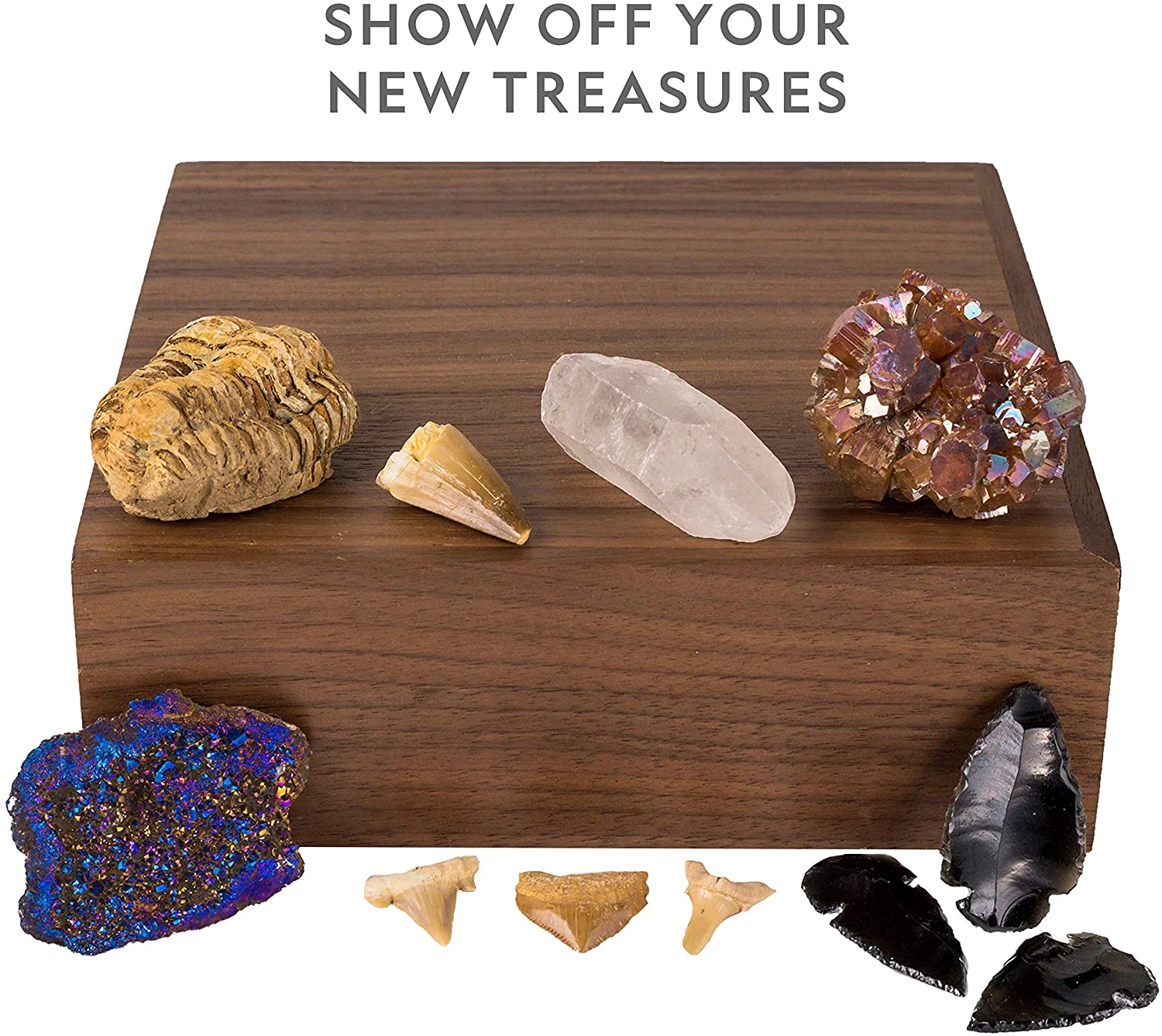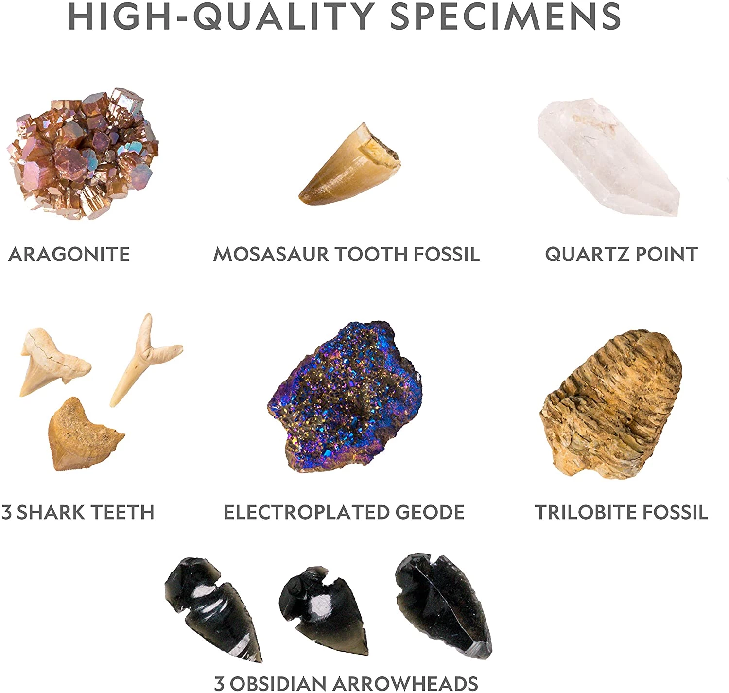Образцы достаточно большого размера, поэтому набор безопасен для детей. Вы получаете три зуба акулы, окаменелость зуба мозазавра, окаменелость трилобита, арагонит, кварцевую точку, обсидиановые наконечники стрел и электроплитый геоде.