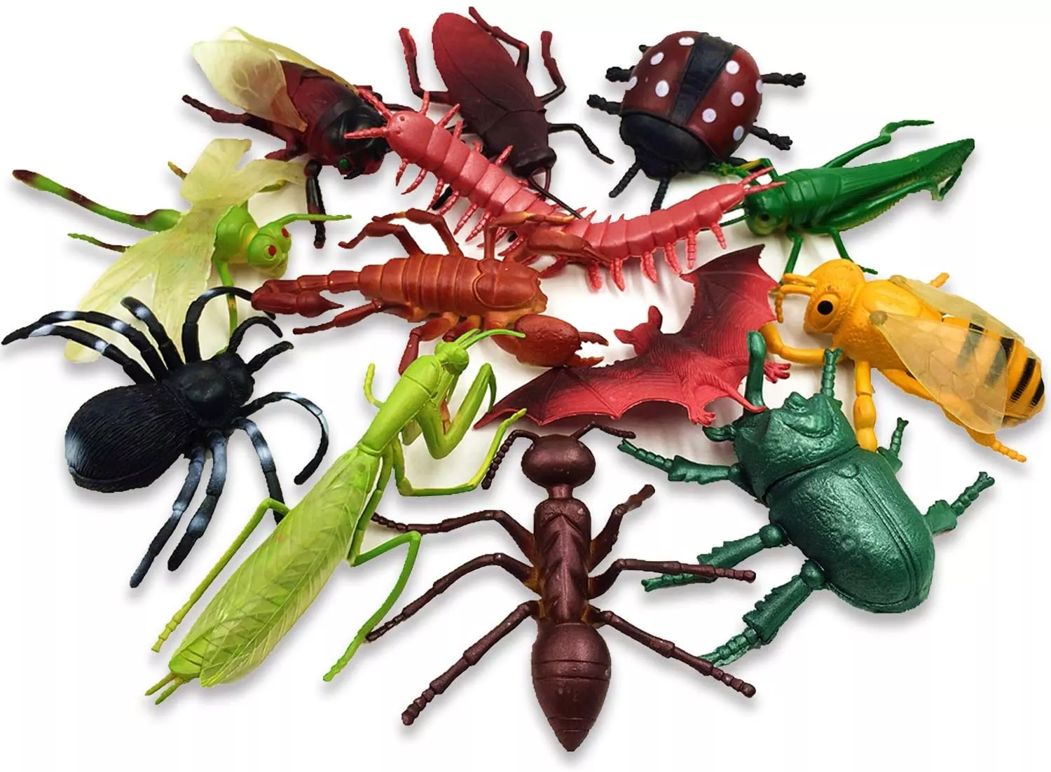 Это большая реалистичная коллекция насекомых из 14 штук, размер варьируется от 8 до 14,5 см. В наборе есть пауки, пчела, кузнечик, муравей, стрекоза, цикада, богомол, летучая мышь, божья коровка, многоножка, скорпион, и другие.