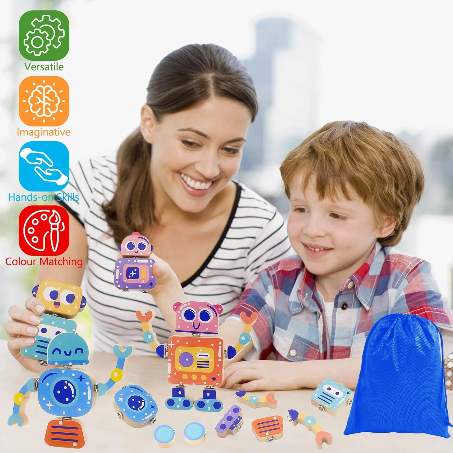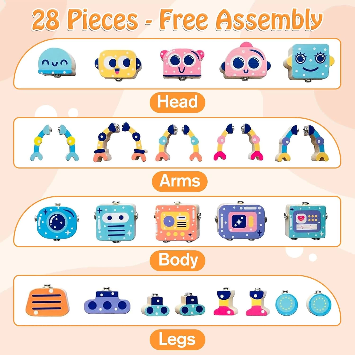 Данный конструктор состоит из 28 деревянных элементов со специальными металлическими защелками. С его помощью дети могут создавать разнообразных роботов с разноцветными защелкивающимися головами, ногами, руками и телами, а детали можно комбинировать по-разному, давая воображению возможность создавать уникальные модели.