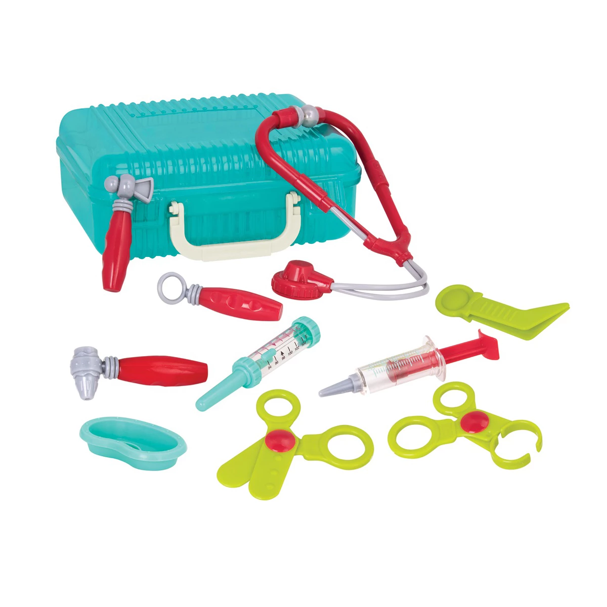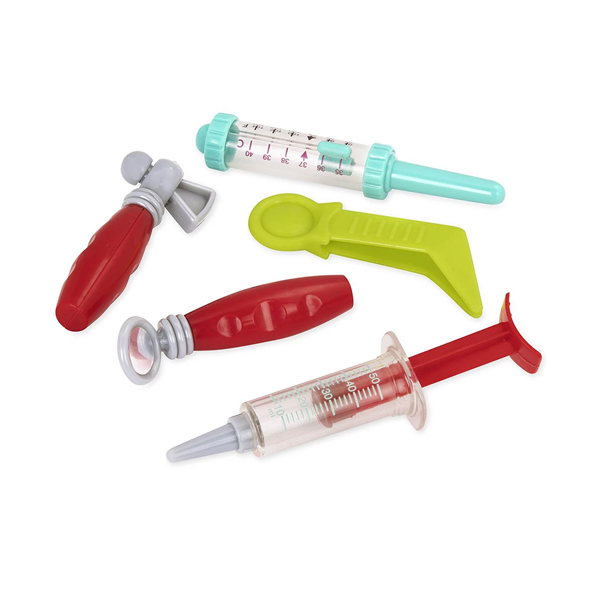 Прекрасный игровой набор, который заинтересует любого ребенка. Он поможет вашему малышу побороть страх перед посещением доктора, или воплотить свою мечту и стать им. В этом наборе есть все необходимое, что требуется в игру современного героя, который лечит людей и любимые игрушки. В удобный чемоданчик помещается фонендоскоп, отоскоп для осмотра ушей, молоток для проверки рефлексов, медицинское зеркало, термометр, ножницы и пинцеты, шприц и подставка для инструментов. Весь набор сделан из качественного пластика и сможет долгое время увлекать вашего малыша в игре.