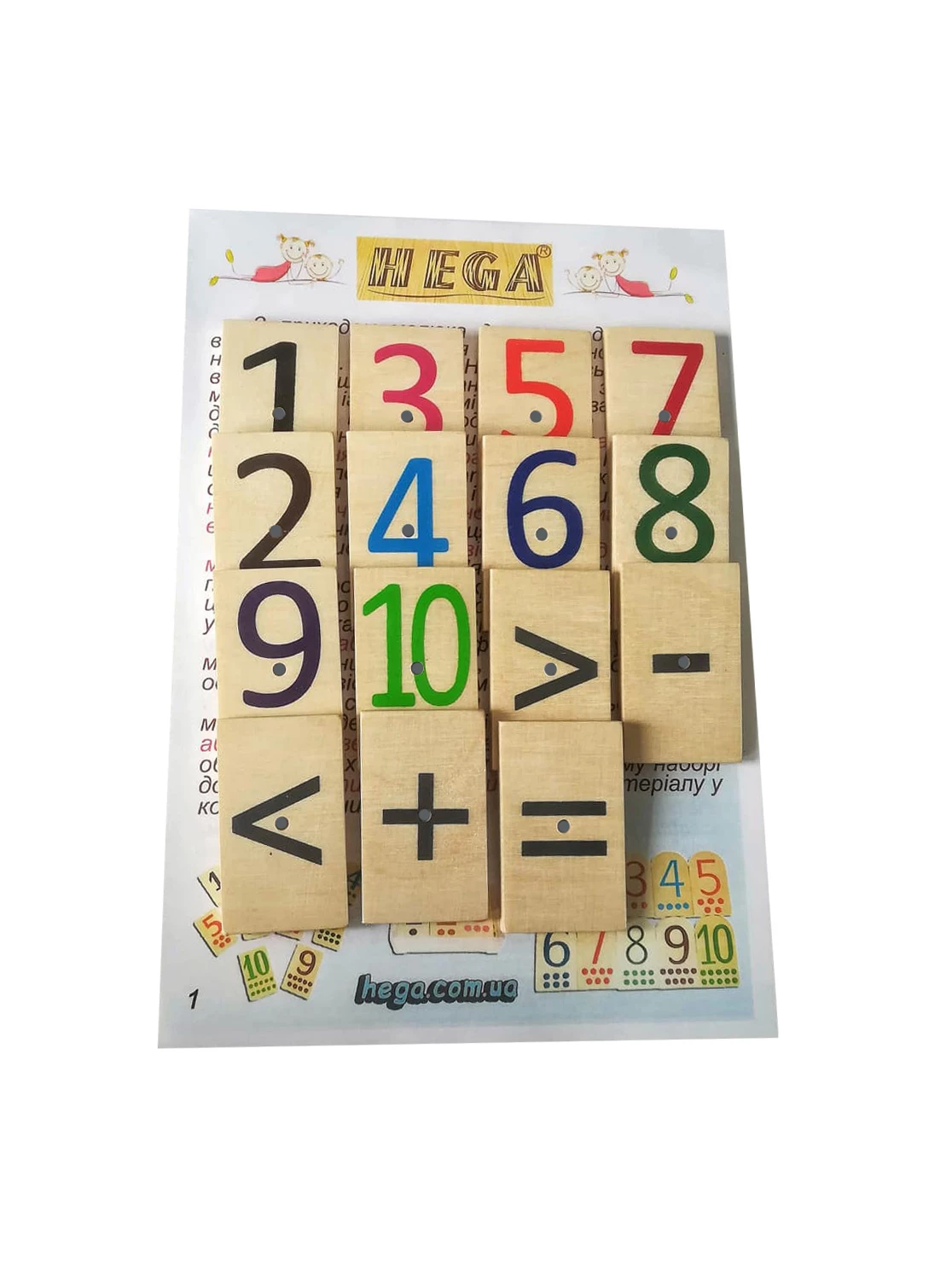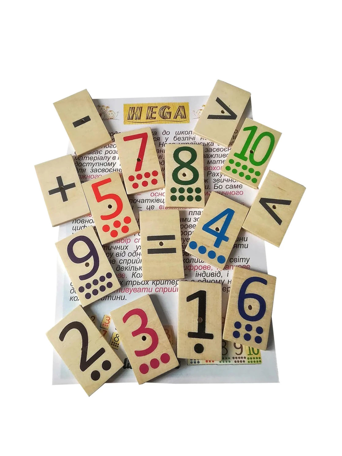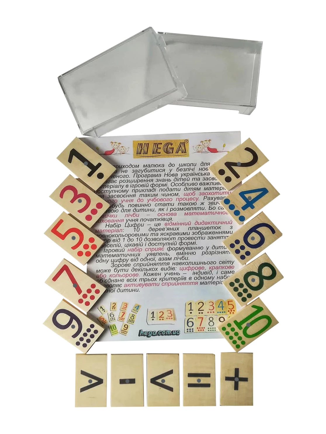 Набор «Цифры и знаки» украинского производителя, фирмы Hega, познакомит ребенка с основами счета, поможет научиться распознавать цифры и понять, что такое состав числа. Кроме того, набор поможет разобраться с числовой последовательностью, числовым рядом, научиться сравнению чисел, познакомит с основами арифметики.