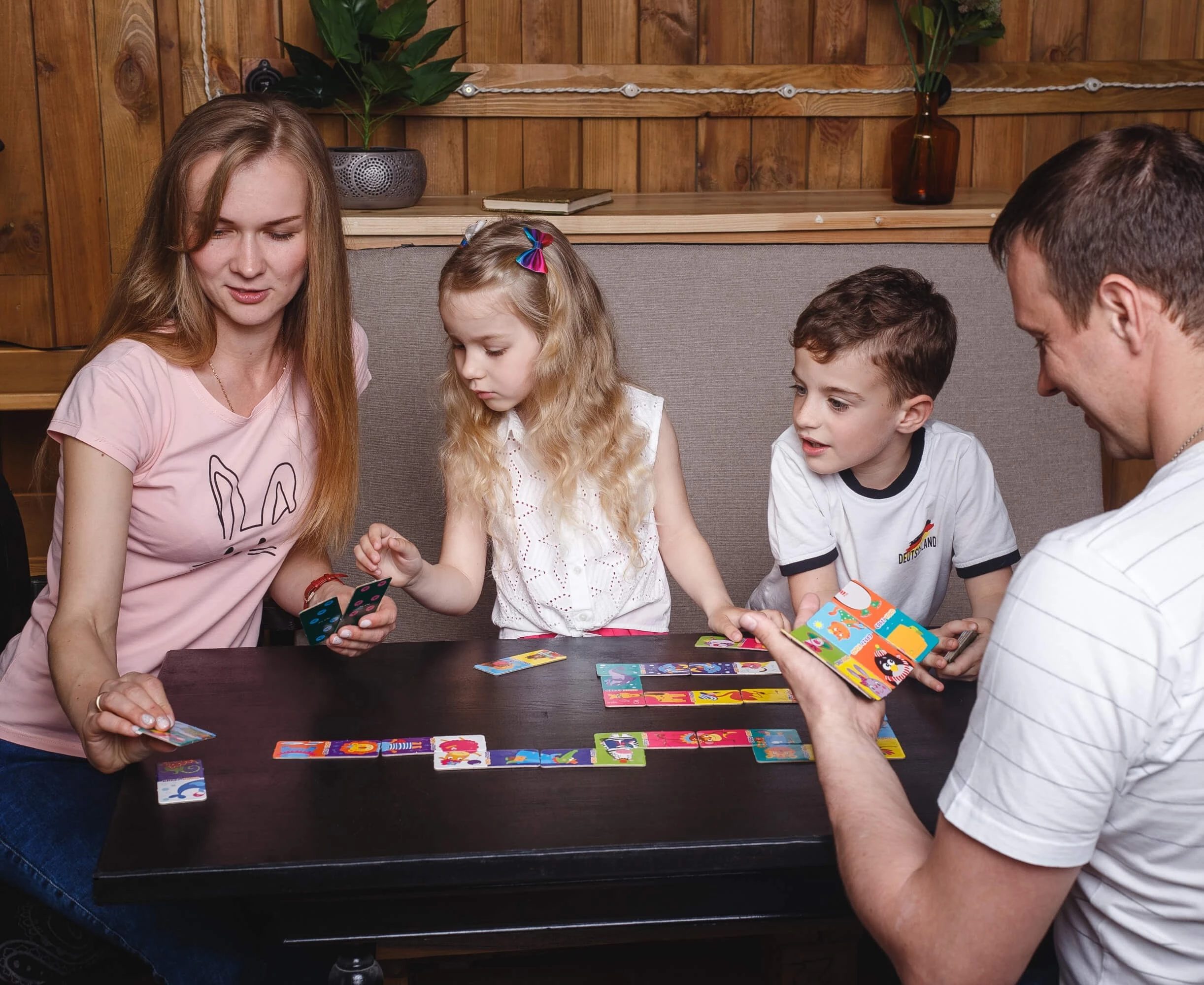 Каждый игрок получает до 7 костяшек домино. Игра ведется по классическим правилам. Выкладывайте по очереди на стол костяшки с совпадающими изображениями.
