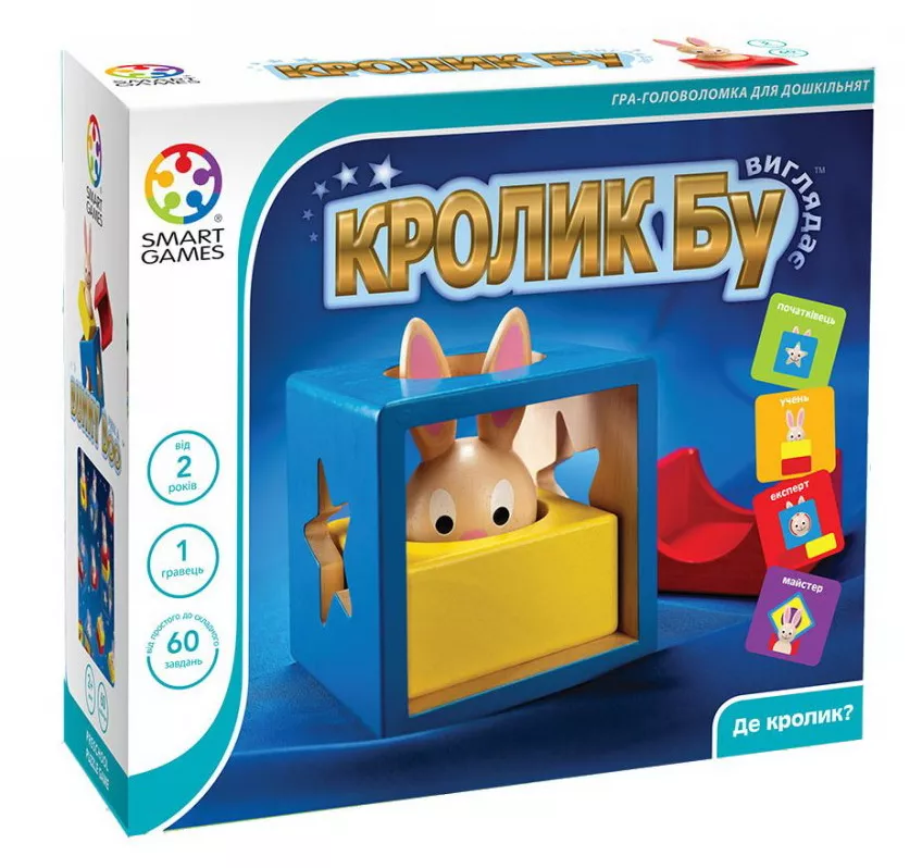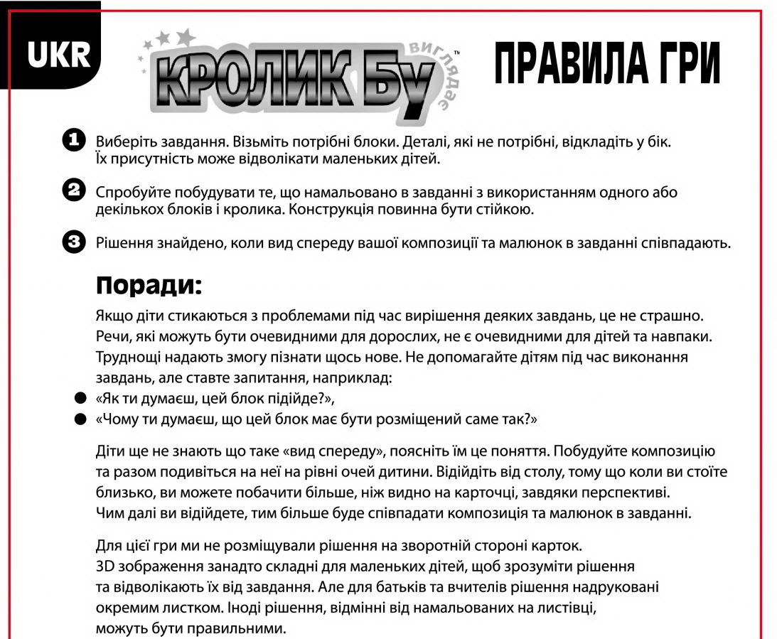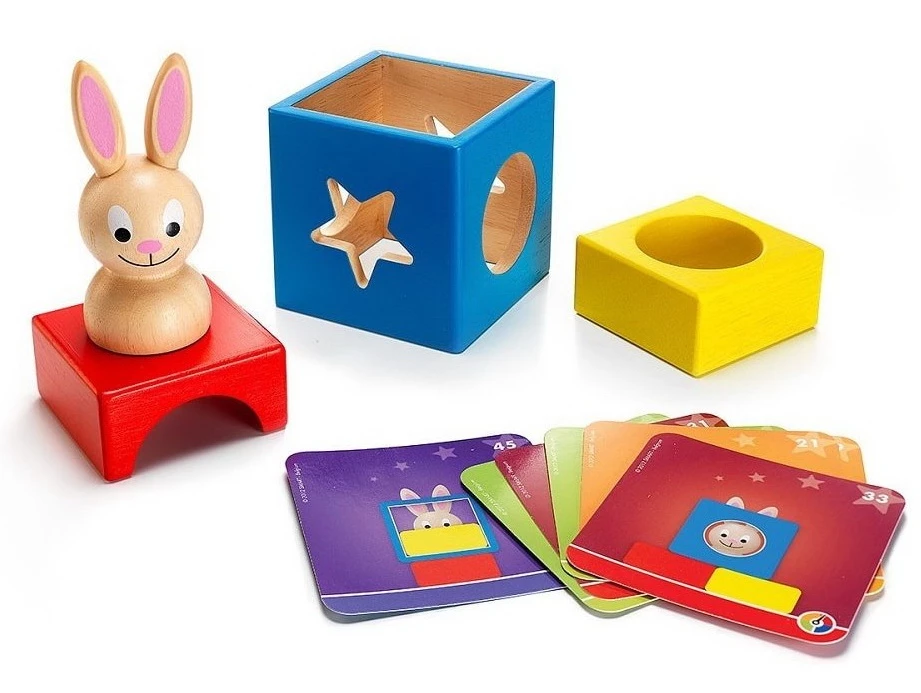 Ребенку понравится играть в эту увлекательную игру. Нужно выбрать карточку с изображением, и правильно воспроизвести его с помощью нескольких блоков и кролика. Начать игру стоит с легких заданий, постепенно усложняя задания. Детям будет проще объяснить понятие "вид спереди" или "вид с верху". Каждый блок из набора, имеет 6 сторон и может сочетаться различными способами с кроликом. Блоки имеют изгибы. и отверстия. Например, кролик не сможет сидеть на круглом отверстии - он провалится. Зато на отверстии звезда - не провалится. Диаметр круглых отверстий в блоках идентичен, поэтому красный и желтый блоки могут стать невидимыми, если они правильно размещены в синем блоке. С этим набором, дети на практике узнают о 3D пространстве. В буклете есть 60 увлекательных заданий: выше/ниже, внутренний/внешний, видимый/скрытый, влево/вправо и т.п.