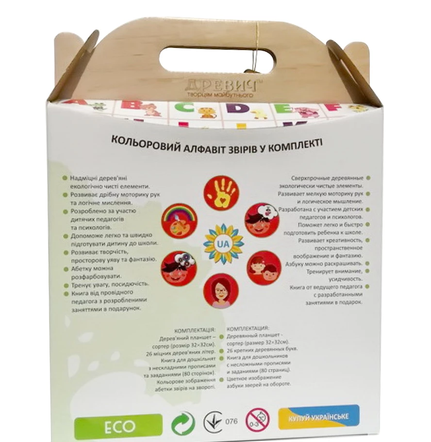 Детки от 3 лет могут использовать набор как сортер, а в сопровождении взрослых смогут изучать буквы ассоциируя их с яркими изображениями животных. Они нанесены с обратной стороны деревянного планшета. Дети 5-7 лет смогут подготовится к школе используя книгу, в которой собраны остроумные веселые стихи, загадки, скороговорки, чистоговорки и несложные прописи.