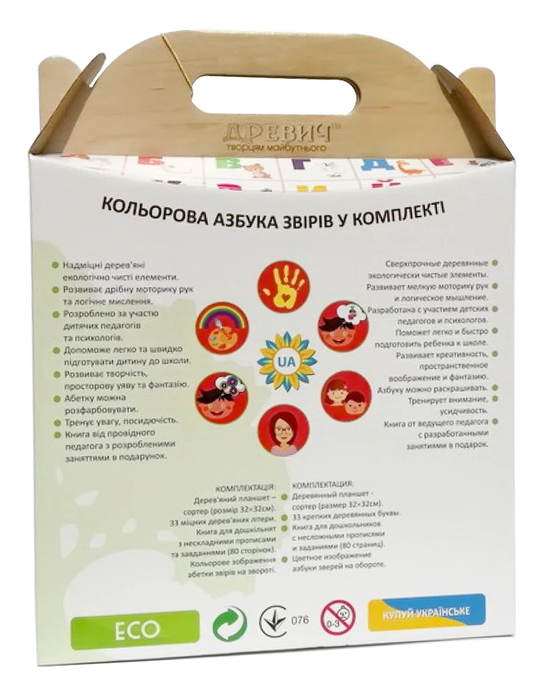 Детки от 3 лет могут использовать набор как сортер, а в сопровождении взрослых смогут изучать буквы ассоциируя их с яркими изображениями животных. Они нанесены с обратной стороны деревянного планшета. Дети 5-7 лет смогут подготовится к школе используя книгу, в которой собраны остроумные веселые стихи, загадки, скороговорки, чистоговорки и несложные прописи.