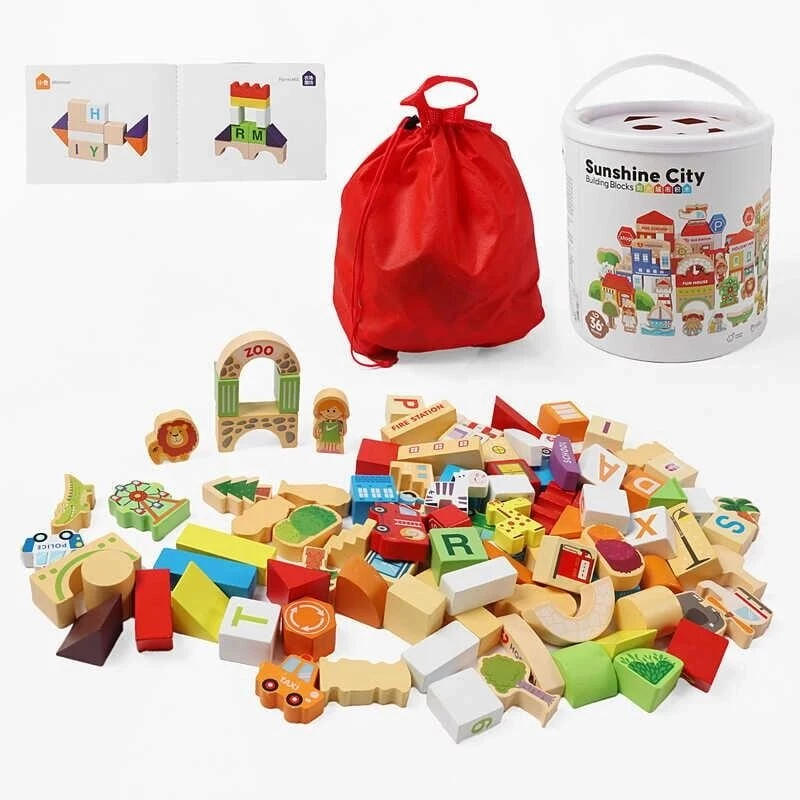 Игровой набор включает в себя деревянные детали, выполненные в виде фигурок людей, животных и транспорта, а также элементы с буквами английского алфавита и названиями учреждений на английском языке. Комплект дополнен пособием с примерами сборки, удобным тканевым мешочком для хранения всех элементов, а крышка ведра функционально используется как геометрический сортер.