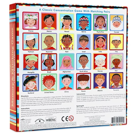 «Дети вокруг света» — это игра от торговой марки Lakeshore на запоминание и сопоставление, которая развивает терпение и навыки памяти. Игроки сопоставляют 48 карточек с изображением детей из 24-х уголков Земного шара, включая Бразилию, Индию, Танзанию и другие. Такая настольная игра не только способствует развитию памяти, но и знакомит участников с разнообразием нашего мира. На обратной стороне коробки указана страна проживания каждого ребенка.