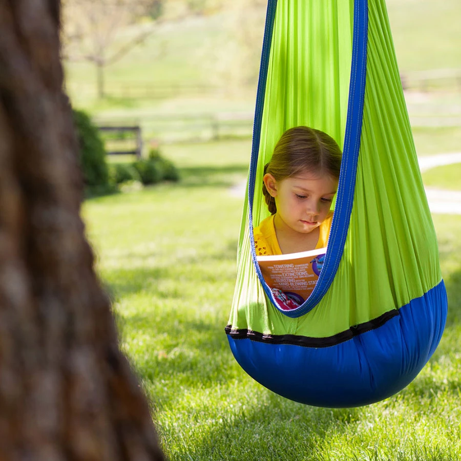 Повесьте его в удобном уголке игровой комнаты или во дворе. Прикрепите его к ветке дерева, где дети могут расслабиться и послушать щебетание птиц и ветер в листьях.