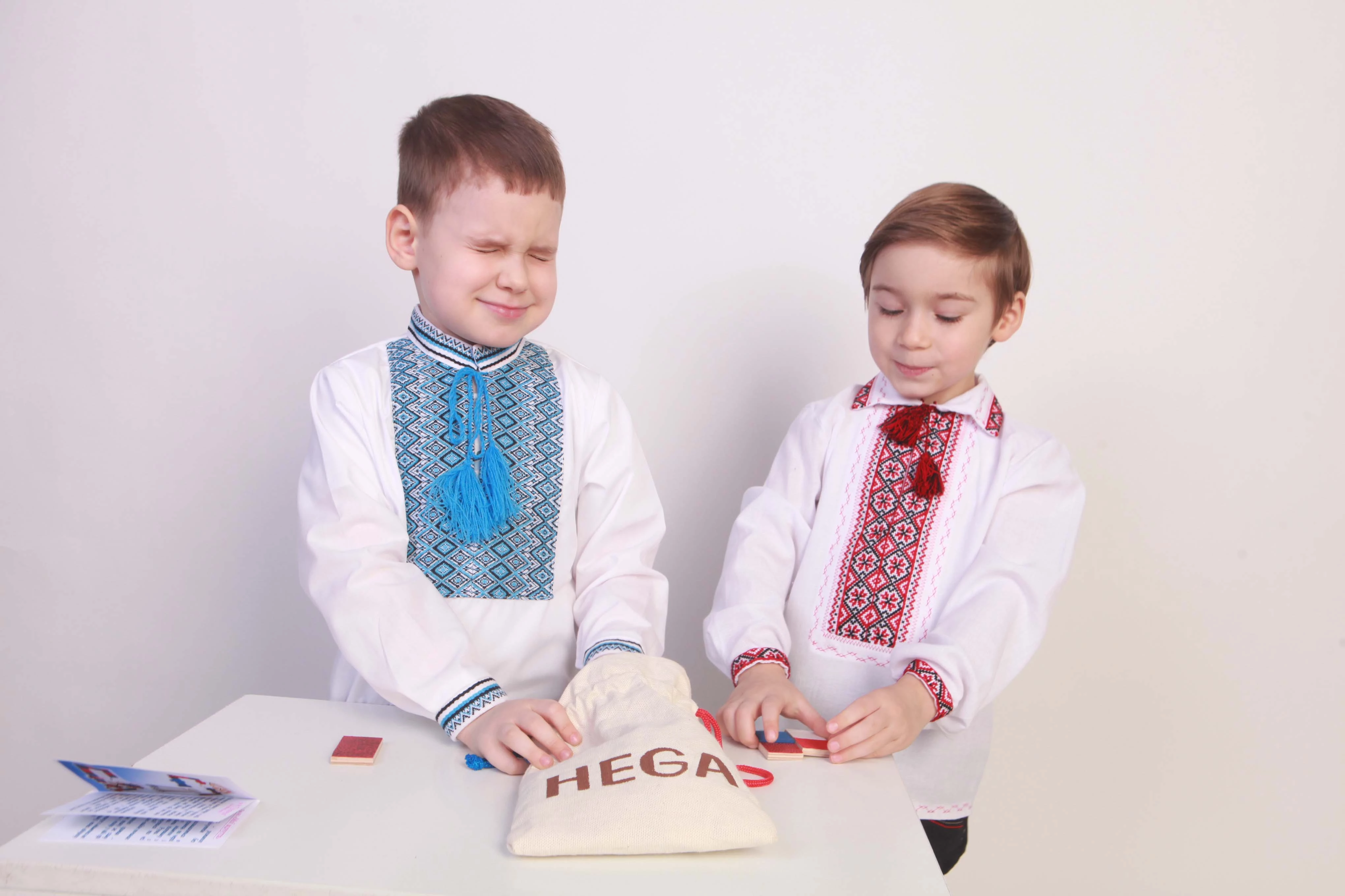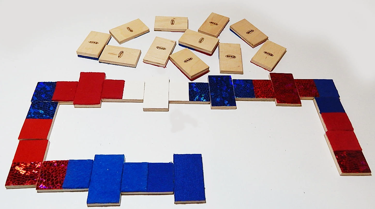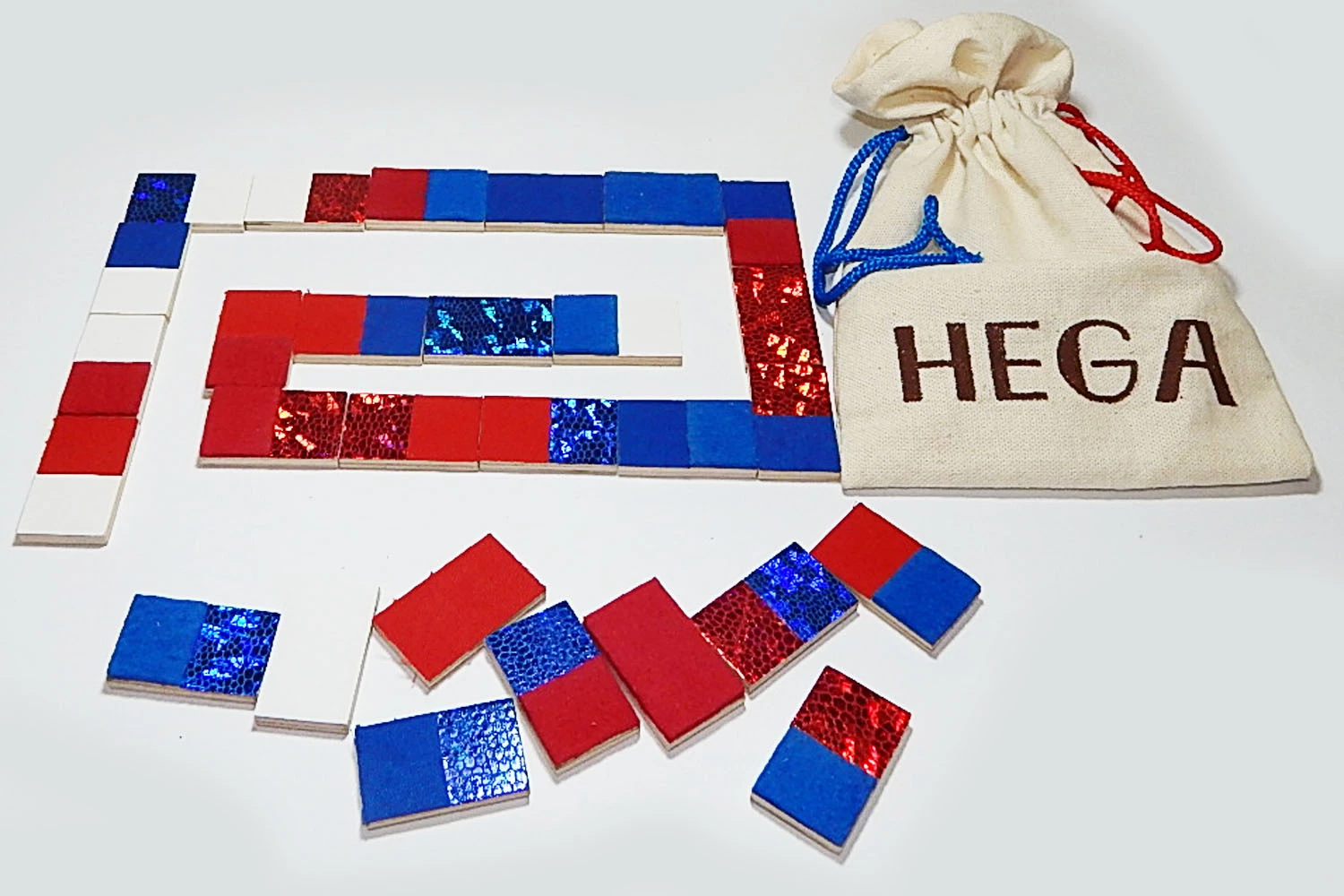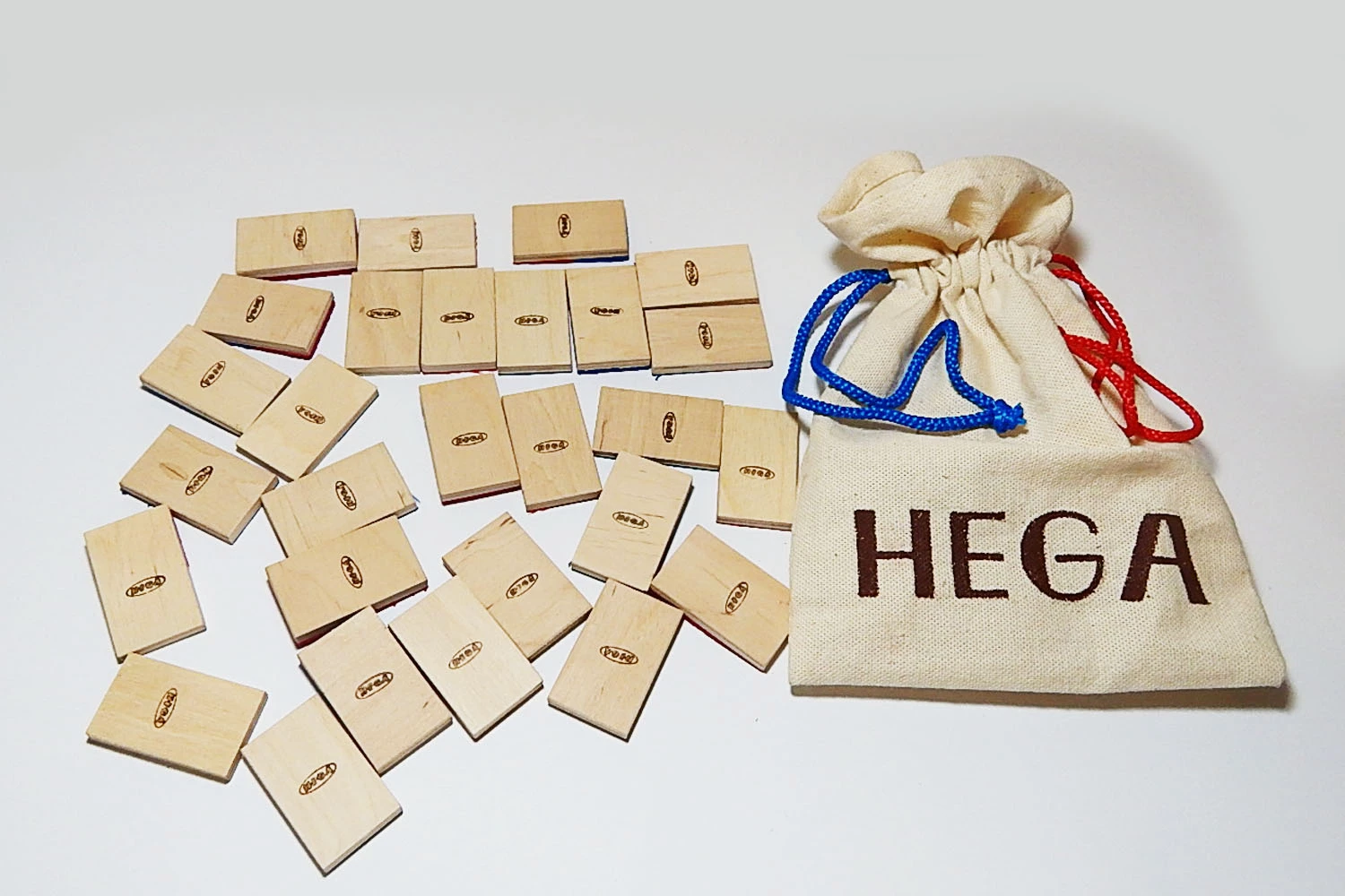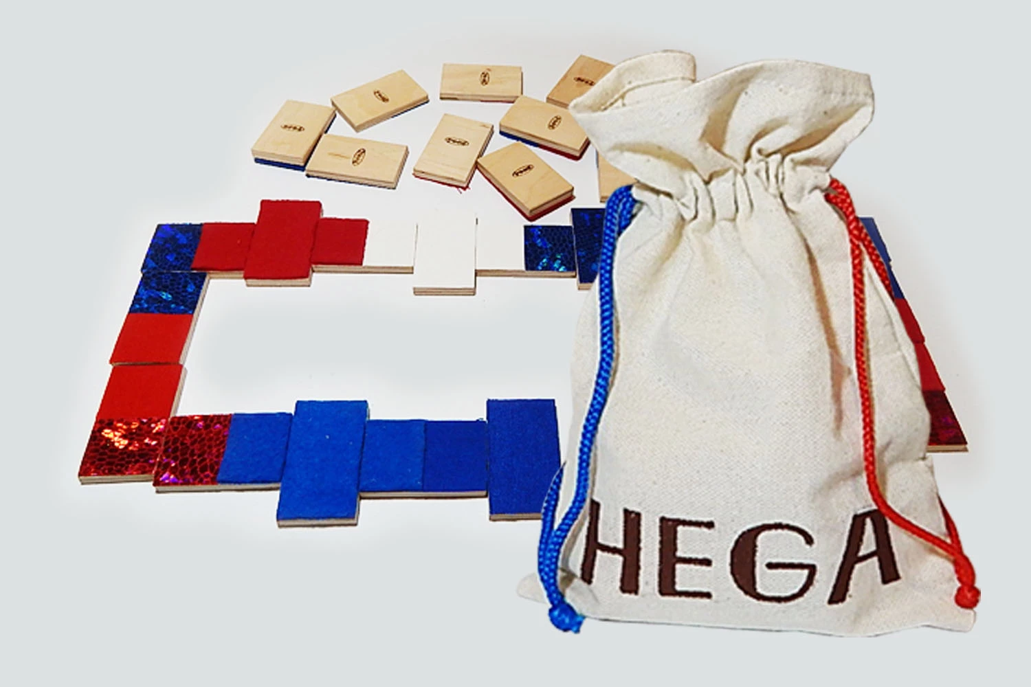 Игра от торговой марки Hega поставляется в полотняном мешочке с затяжками. Наборы фактур тканей на элементах домино не повторяются. В комплекте также присутствуют костяшки-дубли, имеющие одинаковую фактуру. В различных комбинациях использовано семь различных материалов.