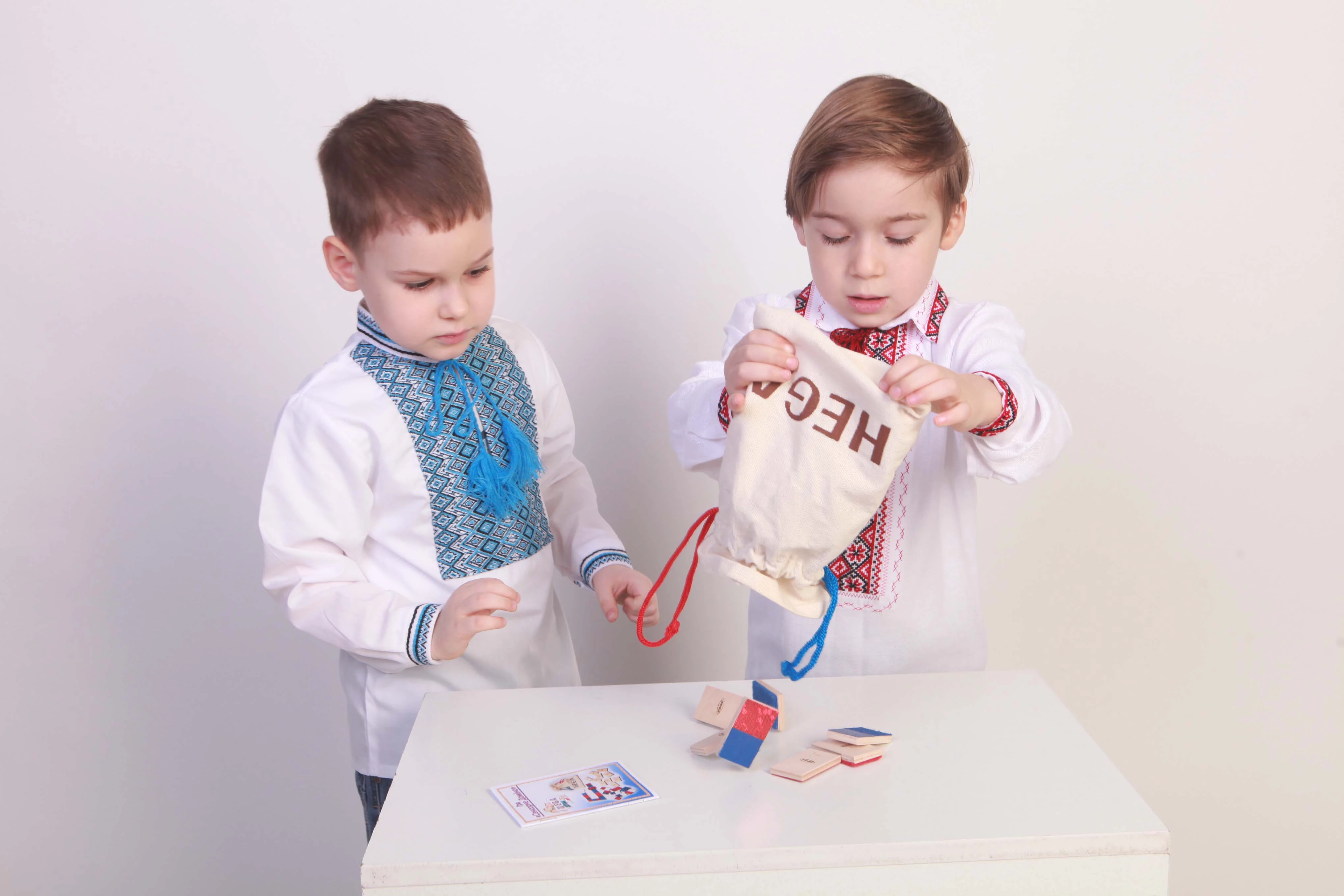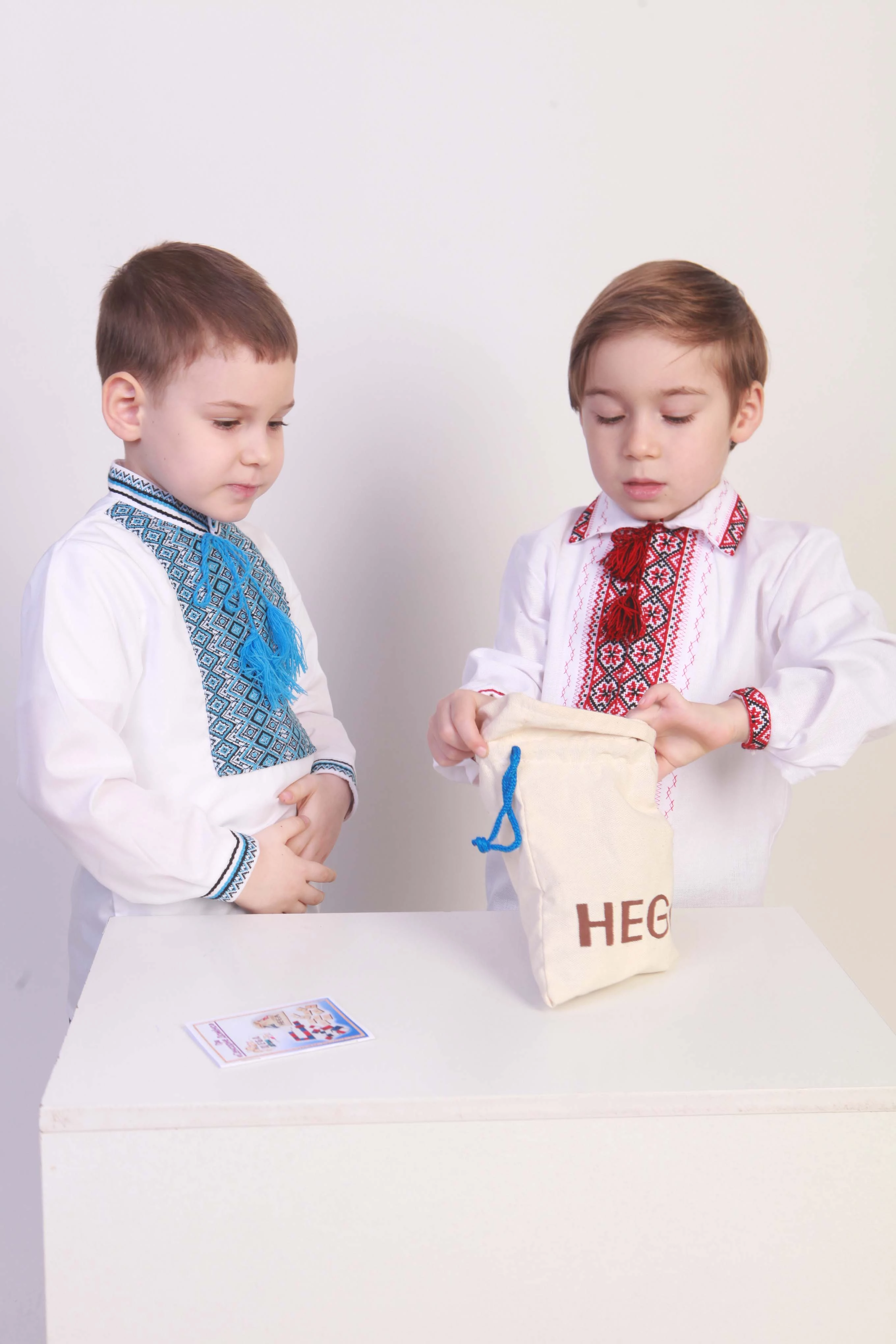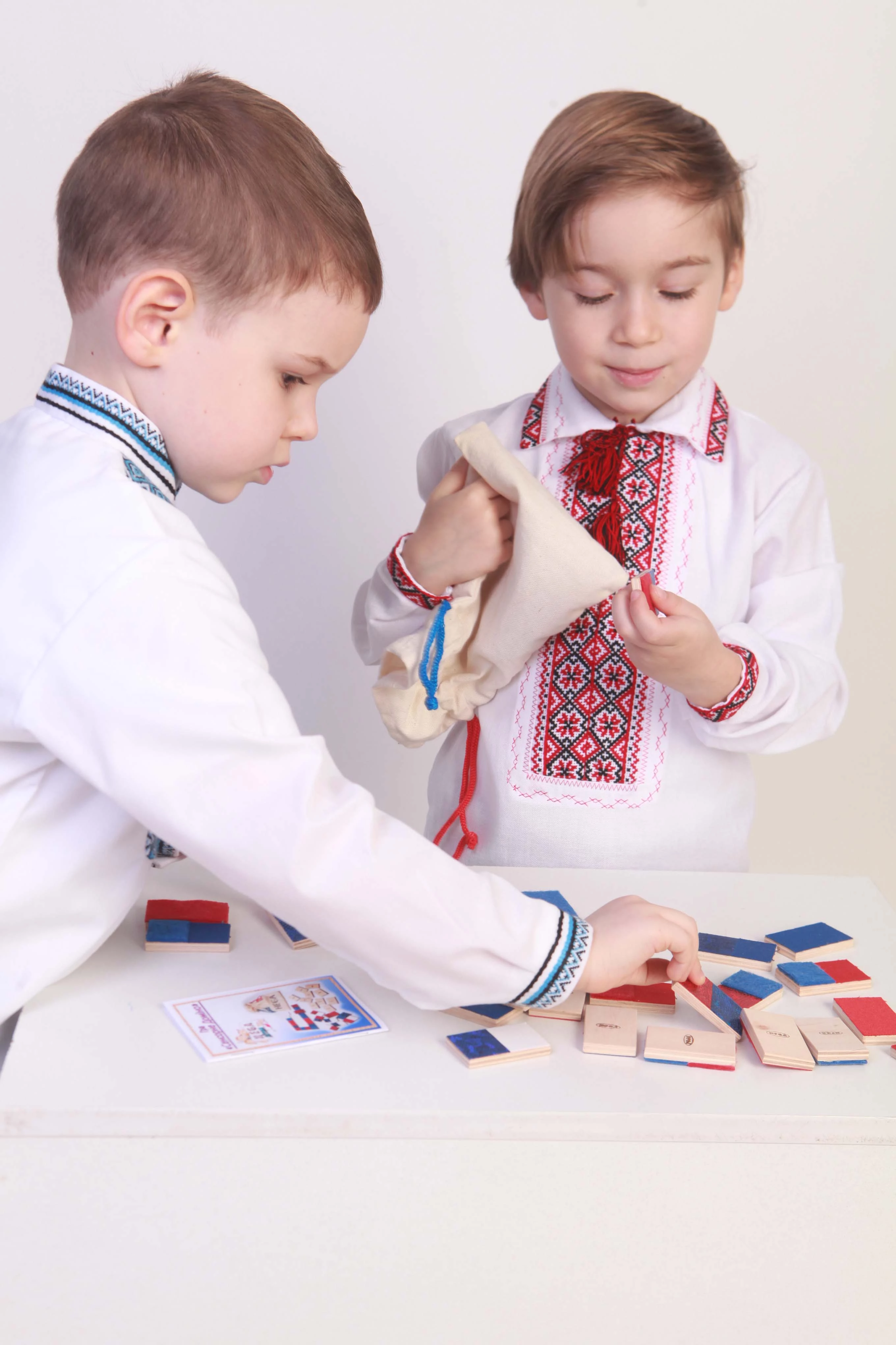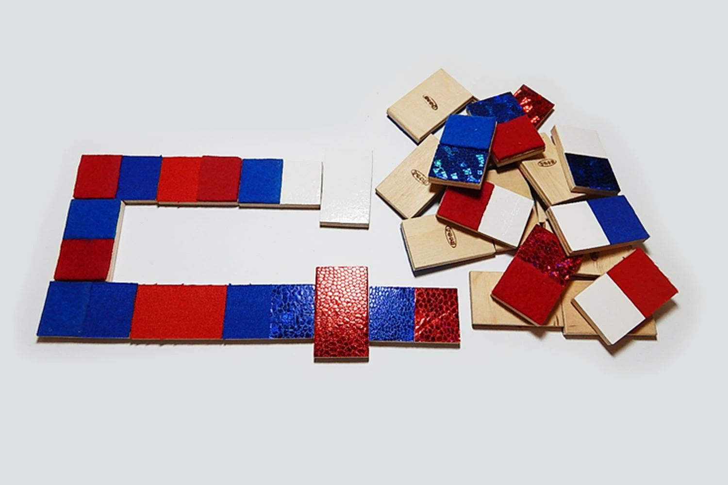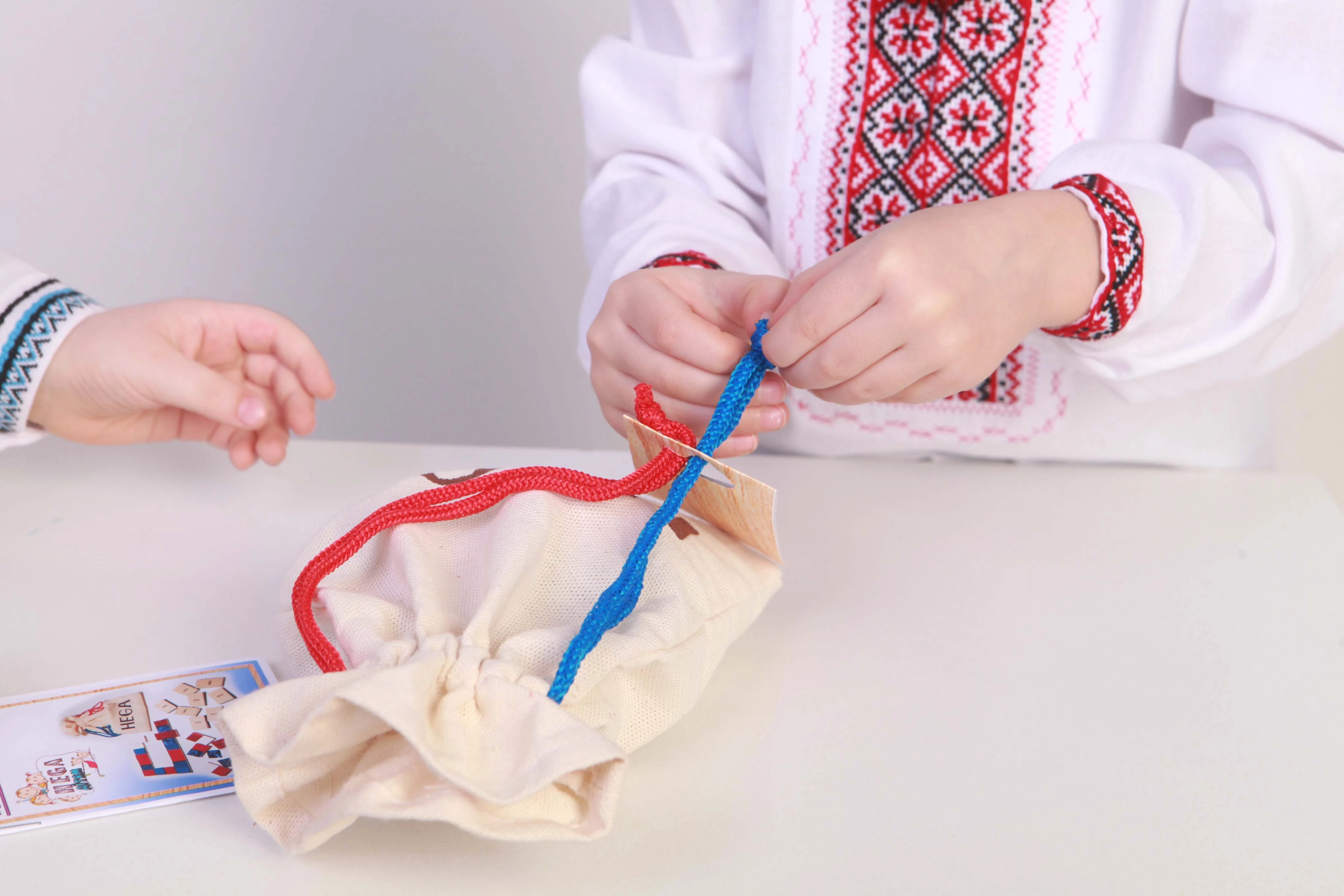 Игра от торговой марки Hega поставляется в полотняном мешочке с затяжками. Наборы фактур тканей на элементах домино не повторяются. В комплекте также присутствуют костяшки-дубли, имеющие одинаковую фактуру. В различных комбинациях использовано семь различных материалов.