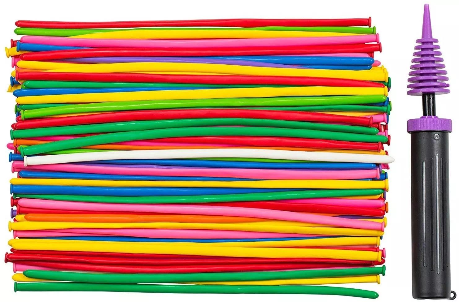 Яркий набор из 100 разноцветных длинных воздушных шаров из латекса понравится всем детям. Шары достаточно прочные, чтобы создавать из них разные фигуры. Этот комплект включает: ручной баллонный насос, который надувает шары вдвое быстрее!
