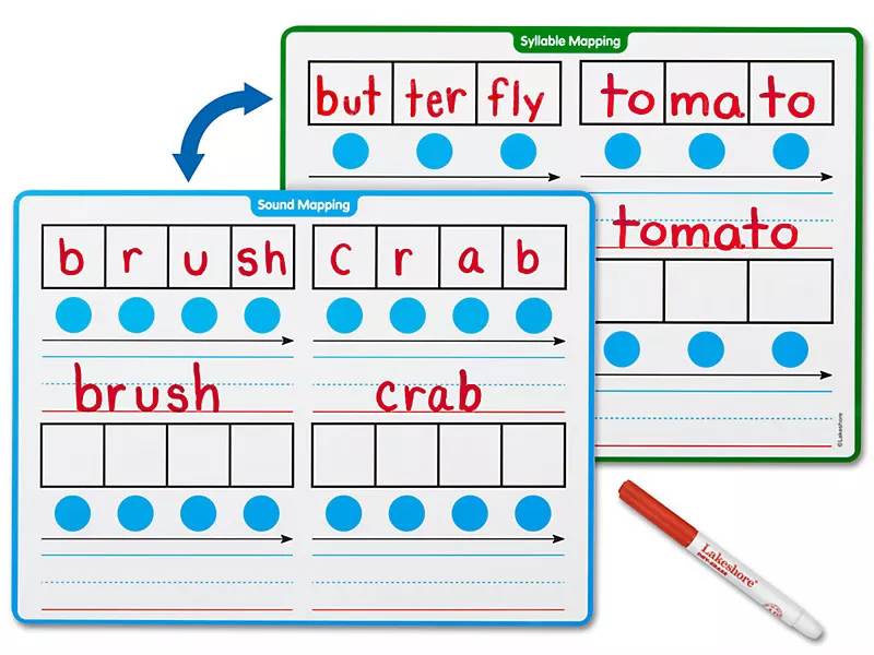 Удобная доска для письма и стирания от торговой марки Lakeshore – отличный инструмент, помогающий учащимся практиковать сопоставление слов и развивать фонематический слух. Имея звуковую карту с одной стороны и слоговую карту с другой, доски снабжены ячейками для сегментации слов точками, помогающими детям произносить по одной фонеме или слогу за раз. А специальные стрелки позволяют детям смешивать звуки или слоги вместе, чтобы произносить слова. Есть даже строчки для практики печати!