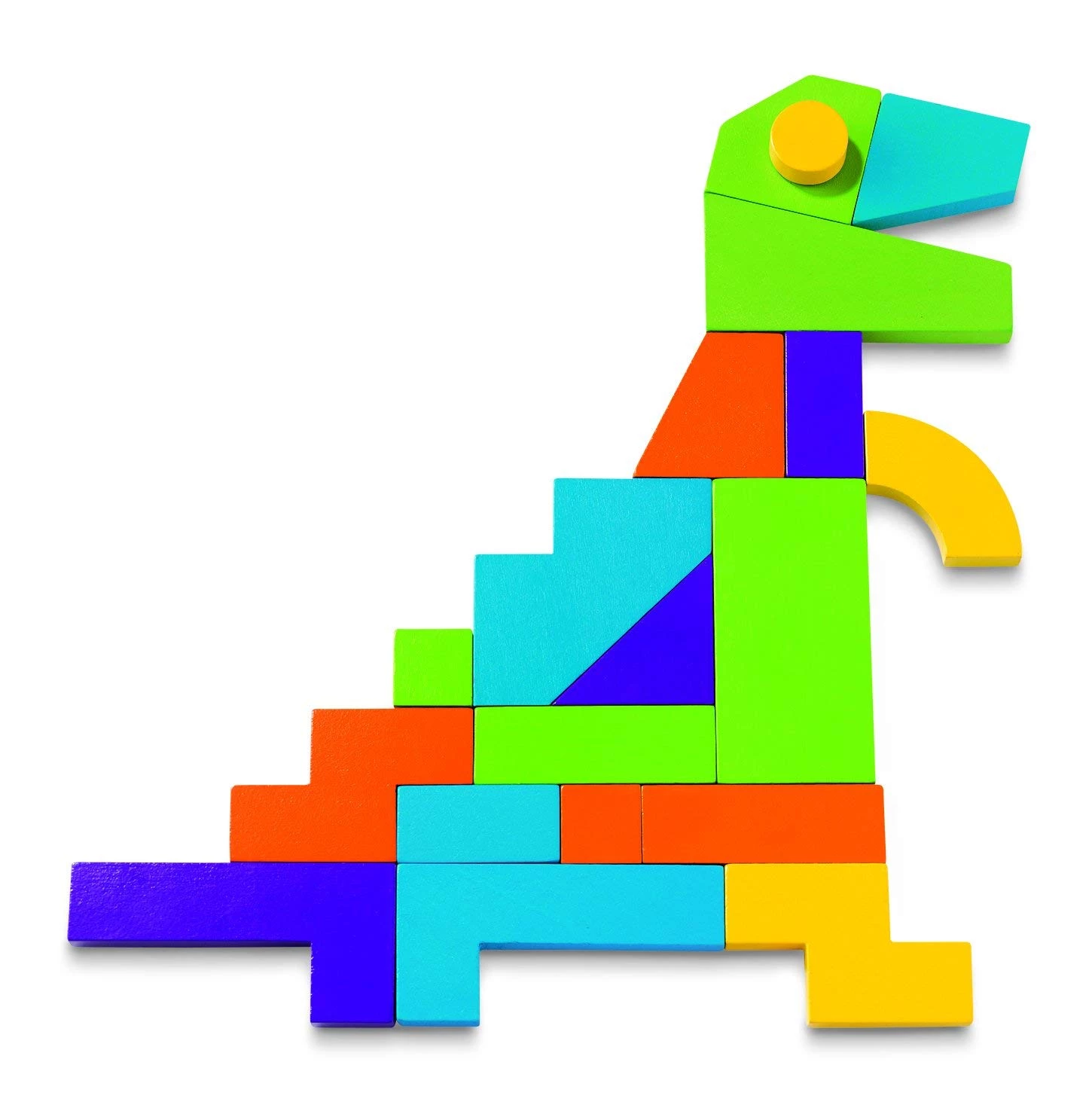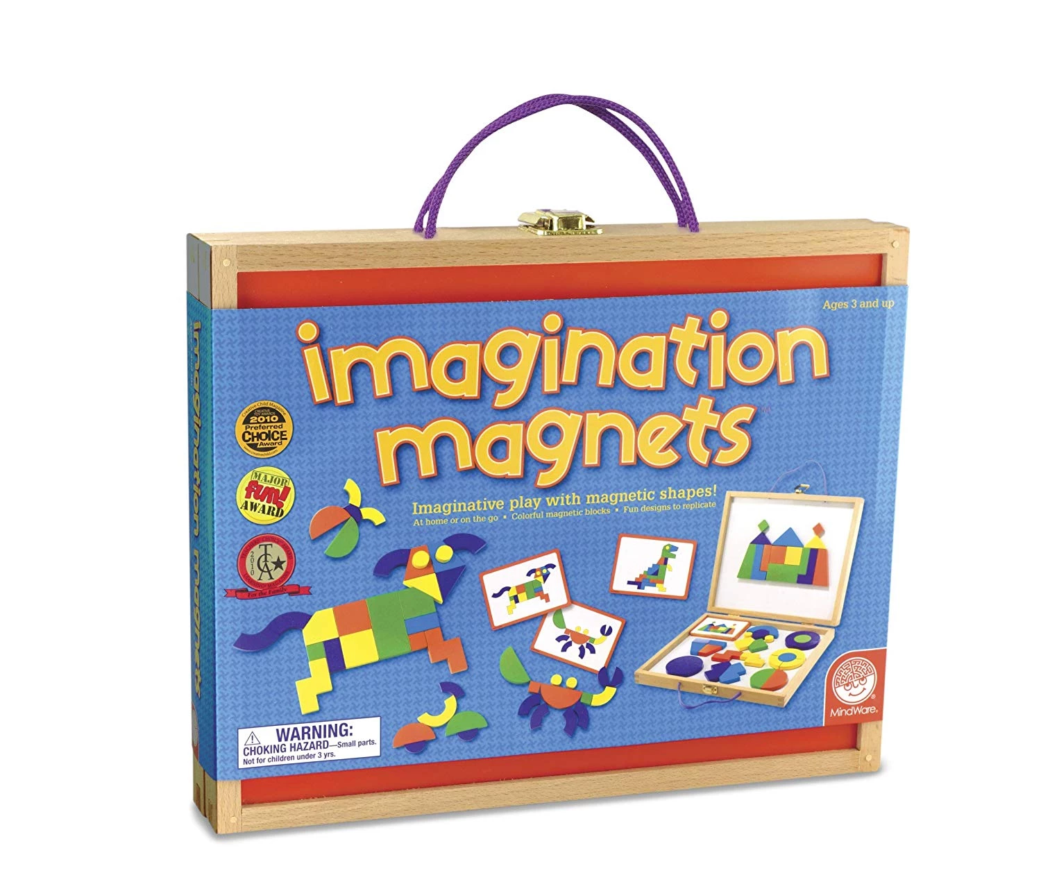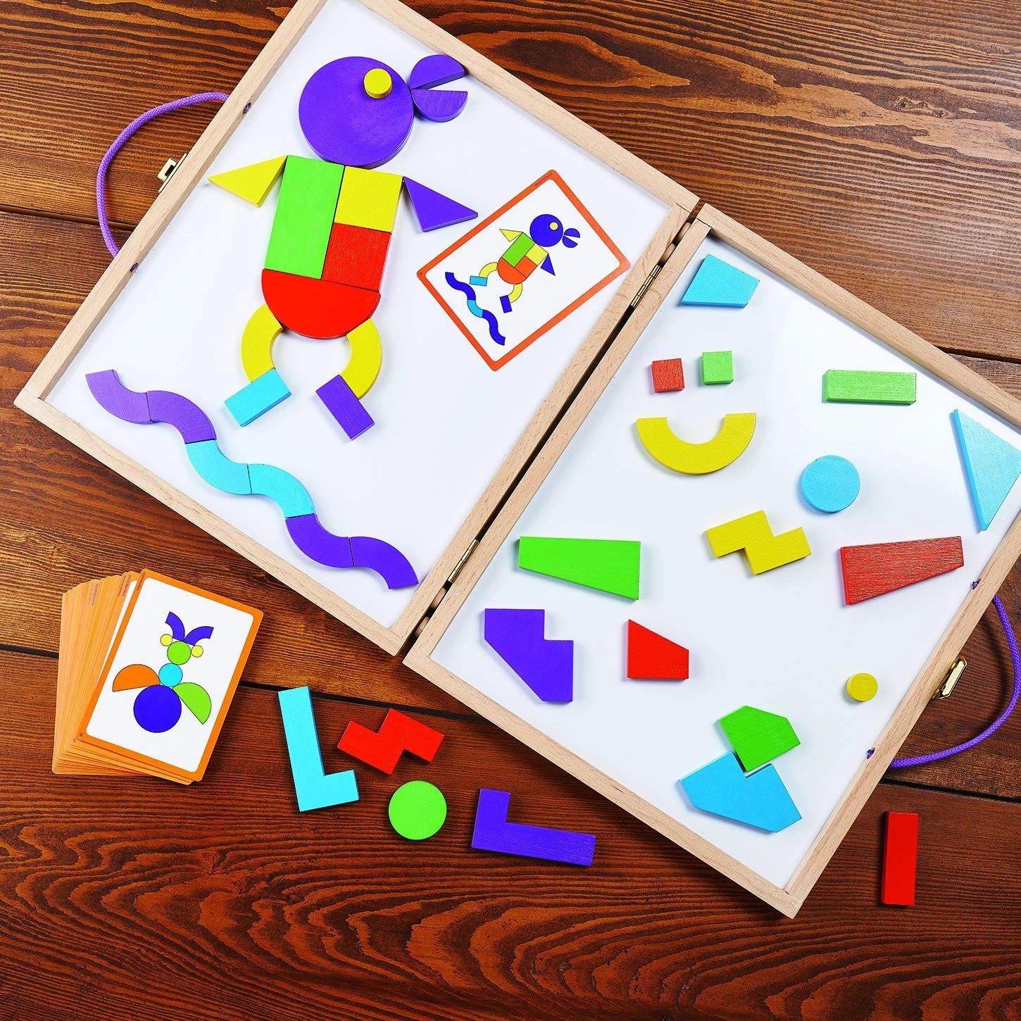 В деревянном чемоданчике – две магнитные досточки, россыпь фигур и карточки с образцами картинок. Чемоданчик с ручками для переноски и с металлическим замочком.