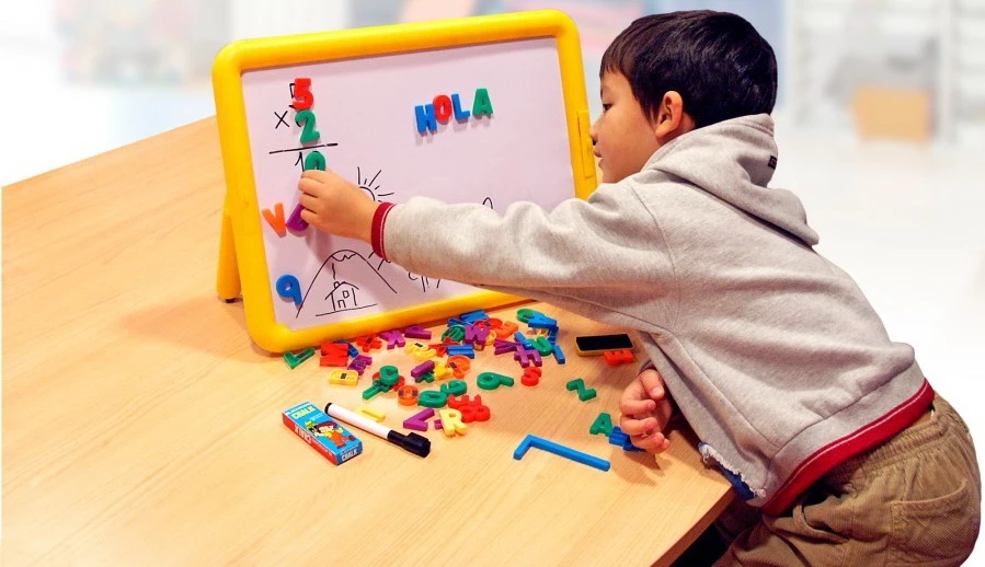 Двусторонняя магнитная доска на подставке для рисования и письма. Развивает навыки письма, чтения и счета. На белой стороне доски можно писать стираемым фломастером, на синей стороне - мелками.