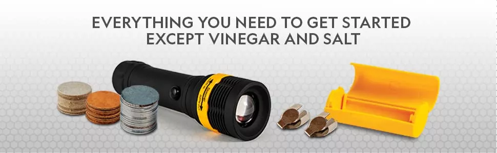 В наборе есть все что нужно для проведения эксперимента, в том числе фонарик, отделение для монет, стальные монеты, картонные монеты, медные монеты, клеммы аккумулятора и руководство по обучению с инструкциями.