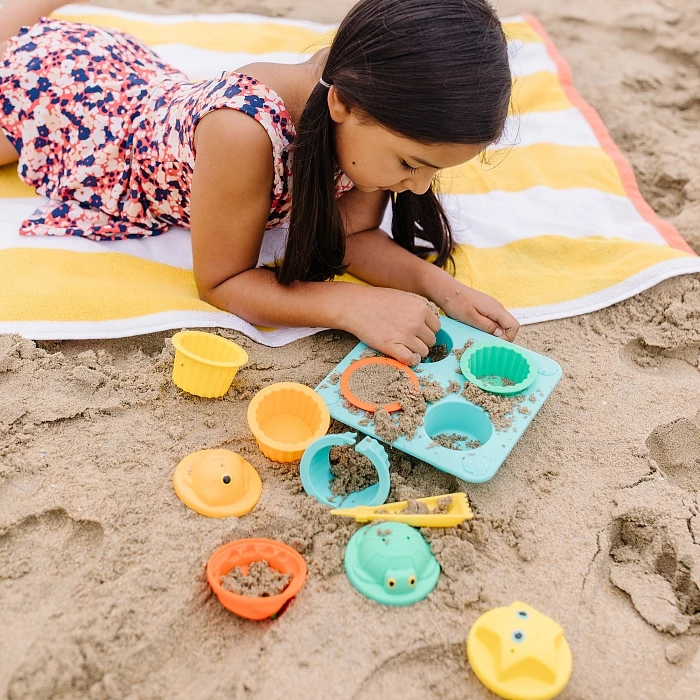 Этот замечательный набор состоит из 12 частей. Чтобы «приготовить» вкусные кексы, необходимо взять формочки, положить специальной лопаткой песок и закрыть их крышечками, выполненными в виде забавных морских обитателей. Кексы готовы!
