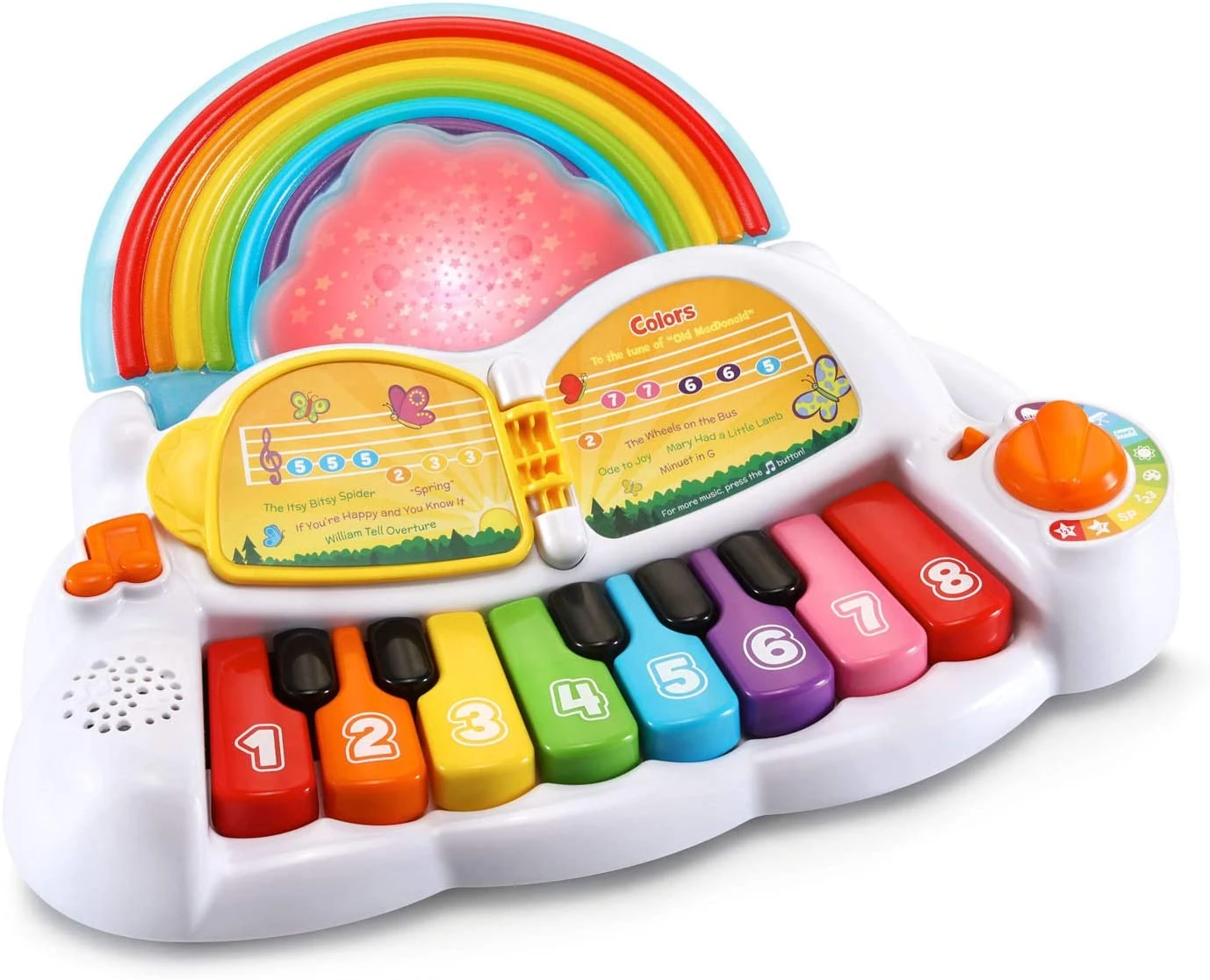 Два игровых режима помогут ребенку выучить некоторые цвета и научат считать. Чтобы выбирать звуки различных инструментов или игровые звуковые эффекты, достаточно повернуть циферблат, которым оснащено игрушечное пианино. Игрушка позволяет прослушивать обучающие песни и веселые мелодии. В игровой комплект входят и ноты, что дает юным музыкантам возможность проигрывать песенки самостоятельно. Пианино воспроизводит 17 мелодий, включая классическую музыку и популярные детские песенки. Все это сопровождается восхитительным радужным световым шоу.