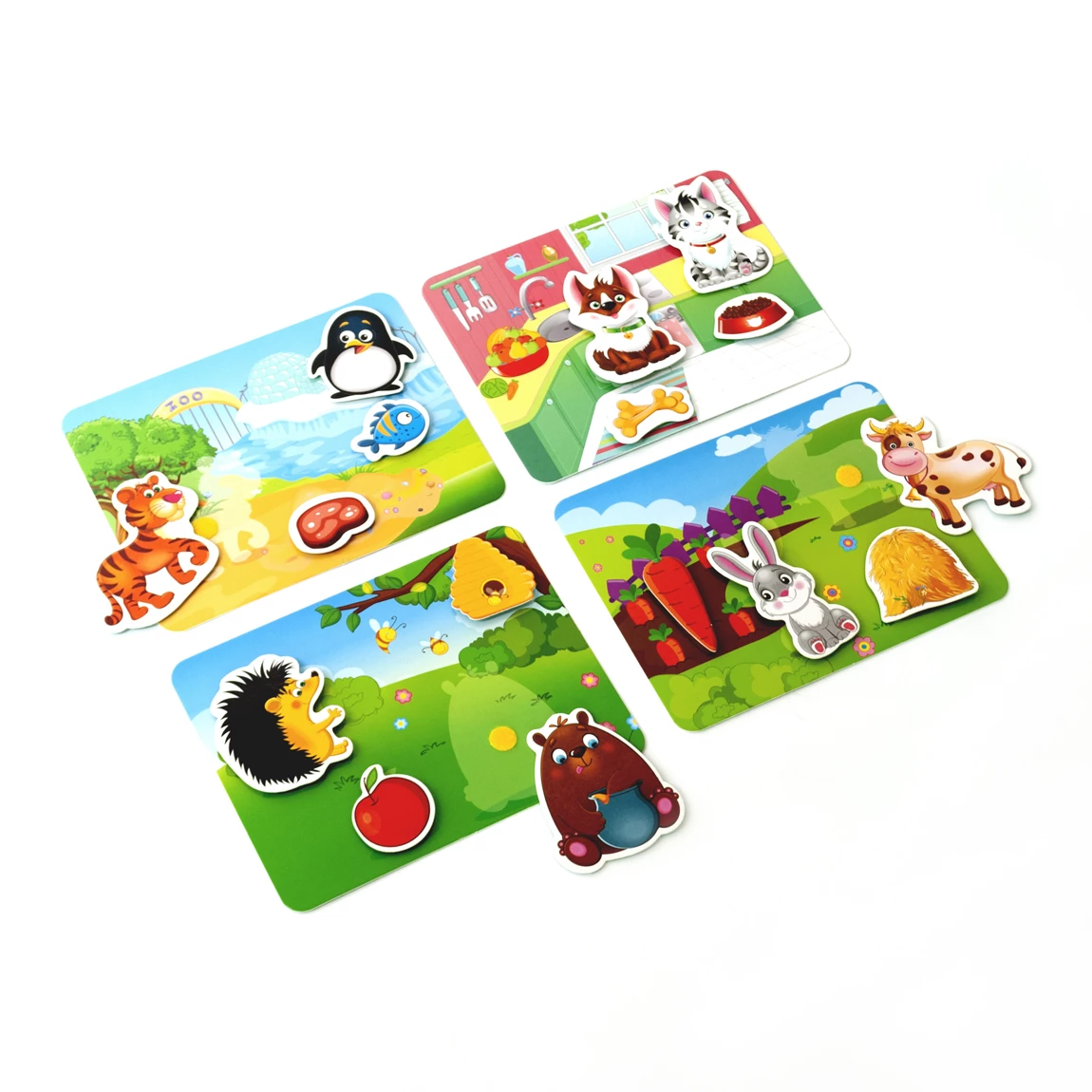 Прикрепляйте фигурки при помощи липучек к игровым полям в правильных местах. Такая игра развивает наблюдательность, внимательность. К примеру, можно взять карточку, на которой изображена грядка. На ней растет морковь. А кто любит есть морковь? Совершенно верно, зайчик. В таком случае, ребенок должен отыскать фигурку этой зверушки и прикрепить ее при помощи липучек.