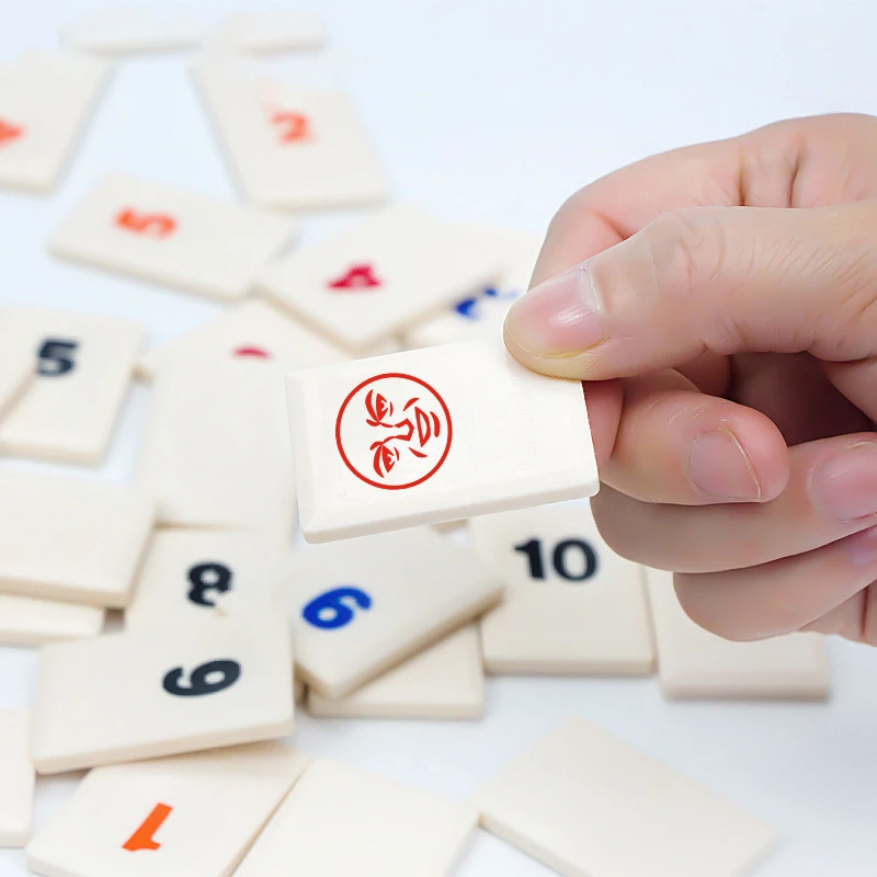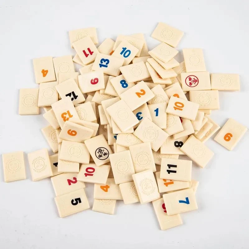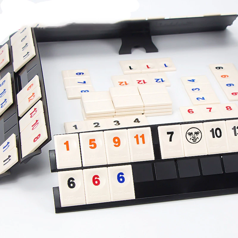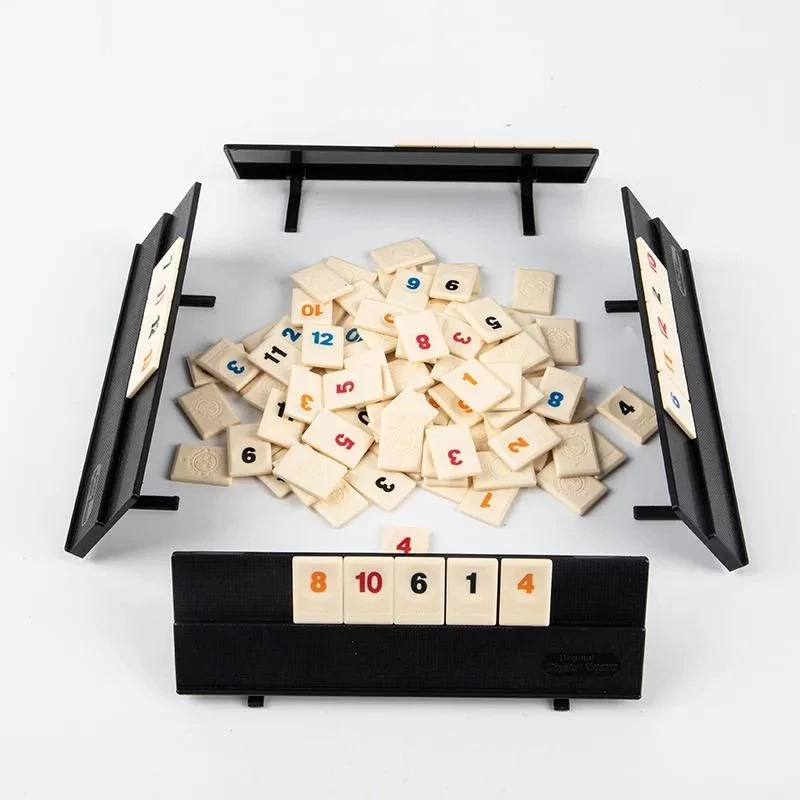 Увлекательная настольная игра для компании или всей семьи. В комплекте небольшие плитки - игровые карточки и подставки. Игрокам нужно составить из них группы по 3-4 плитки одного номинала, но разной масти или последовательности. Например, три или больше плиток одной масти: 1,2,3,4 пики. Игрок, первый использовавший все свои игровые фишки - побеждает.
