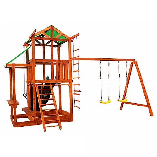 Замечательный детский игровой комплекс состоит из множества увлекательных и интересных функций. Ваш ребенок сможет лазать по подвесной лестнице, канату, стенке для лазания, катиться с горки, забираться на второй этаж, кататься на качели. В этой модели есть удобный столик и скамейка, которые будут удобны и детям, и родителям. Сам комплекс достаточно объемного размера, поэтому он подойдет, как и для детского садика, так и для двора многоквартирного дома, дачи. Прочное и долговечное качество сможет радовать детей из поколения в поколение, а разнообразность лестниц и лазеек, положительно повлияет на физическое развитие ребенка.