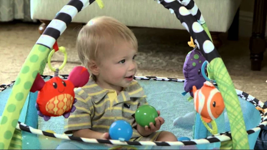 Прекрасный развивающий коврик для самых маленьких. С ним можно придумать множество игр и отвлечь малыша на продолжительное время. Четыре подвесные игрушки со своеобразным звуком и вибрацией, разные на ощупь так и будут манить ребенка их потрогать. Хорошо развивает внимательность и мелкую моторику малыша с самого маленького возраста. Можно сделать мягкий бассейн с шариками или другими игрушками что привлечет к большей активности. В набор так же входят 4 подвесные игрушки.