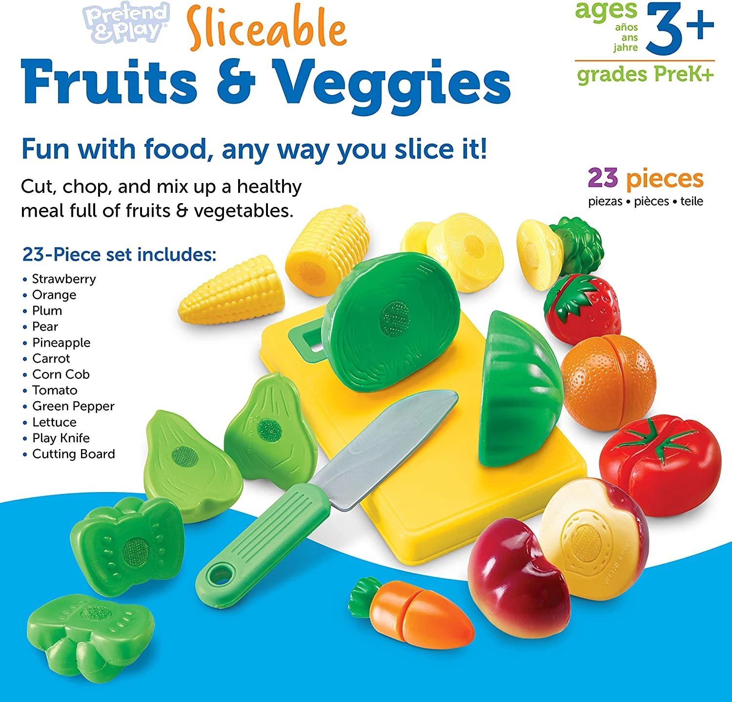 Помогайте ребенку пополнять словарный запас и развивать навыки распознавания предметов с включенными в набор игрушечными сливами, грушами, ананасом, зеленым перцем и другими продуктами.