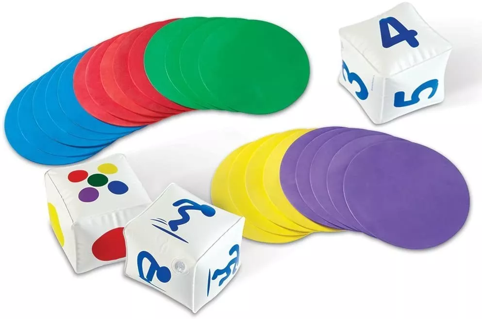 В набор входят 25 круглых ковриков из пенопласта 5 цветов, 3 надувных куба с изображением упражнений, цветов и чисел, а также руководство по занятиям.