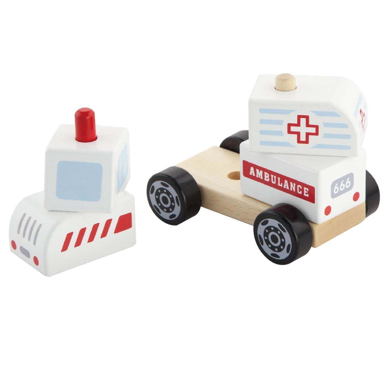 Белая машинка скорой помощи состоит из нескольких блоков, и основы на колесах со стержнями. Игрушка сделана из древесины. После того как машинка собрана. можно с ней играть.