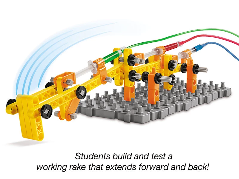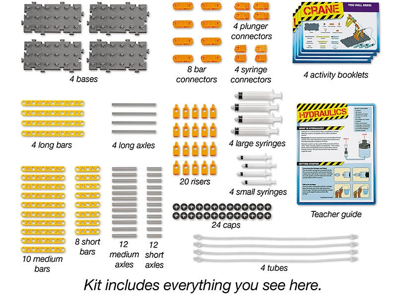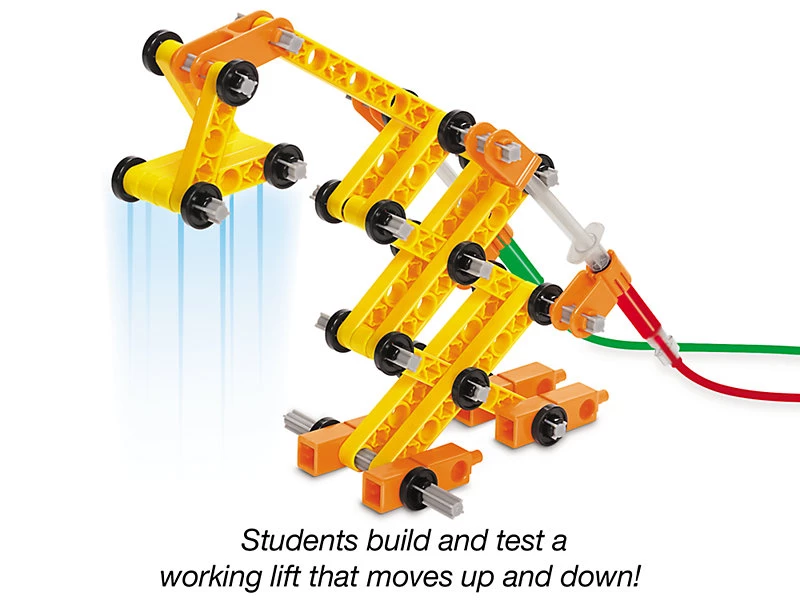 Дети изучают механическую силу жидкости в движении, создавая свои собственные гидравлические машины! В комплекте есть 4 буклета с подробными инструкциями и строительные элементы, которые нужны детям для создания 4 различных гидравлических машин - от рабочего подъемного моста до крана, который поднимает предметы. Кроме того, в наборе есть шприцы и тубы, которые дети наполняют водой и подключают к каждой машине - учимся преобразовывать энергию, приводя в движение каждую машину!