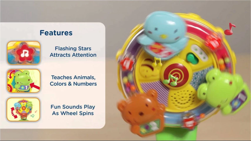 Разноцветная музыкальная игрушка Колесо обозрения развивает мелкую моторику и воображение. Игрушка крепится на поверхности с помощью присоски. Во время игры, ребенок услышит 5 песен и более 45 звуков и фраз, которые развивают словарный запас малыша. Разноцветные кнопки в виде милых животных рассказывают ребенку про числа, цвета; звездочки весело мигают с каждым звуком.