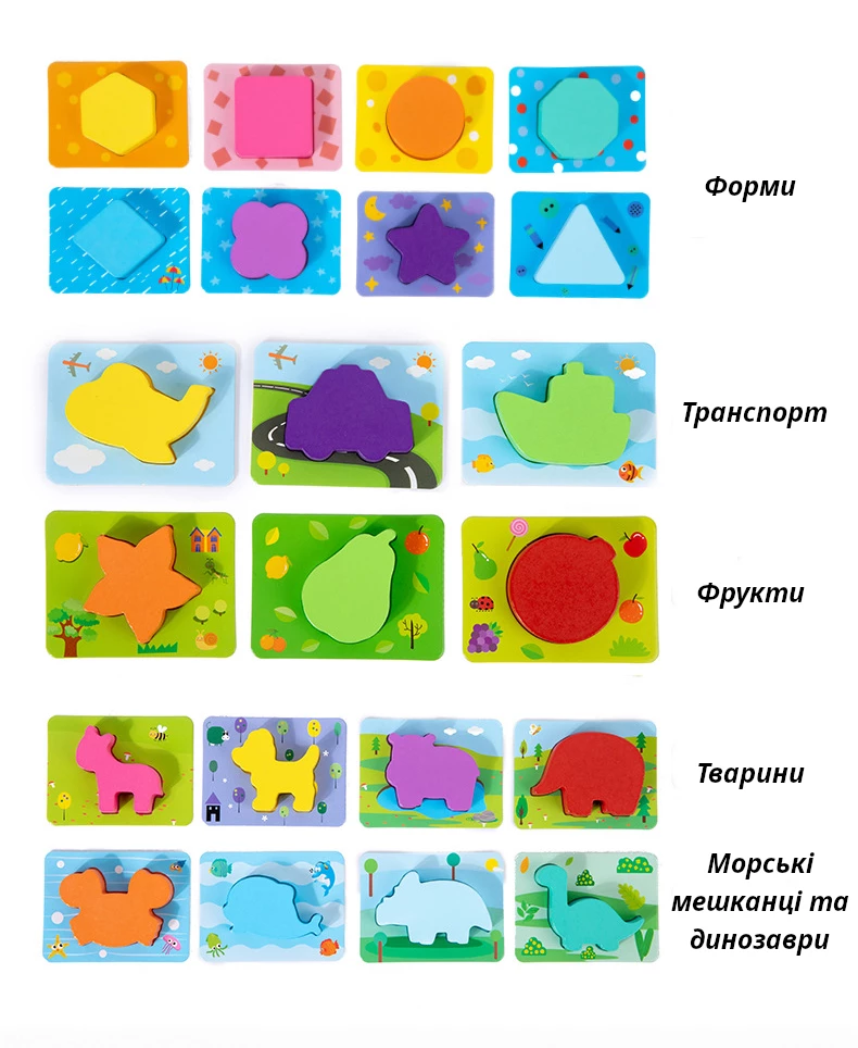 Этот развивающий деревянный сортер является идеальным инструментом для первого знакомства малыша с окружающим миром. Набор включает 22 красочные карточки-основания и соответствующие им объемные фигурки, разделенные на пять тематических категорий: геометрические формы, транспорт, фрукты, животные и динозавры. Каждая деталь выполнена из натурального дерева, имеет сглаженные края и окрашена безопасными красками на водной основе.