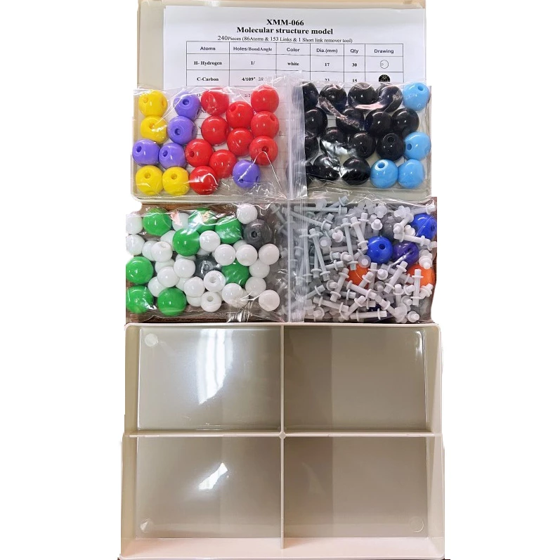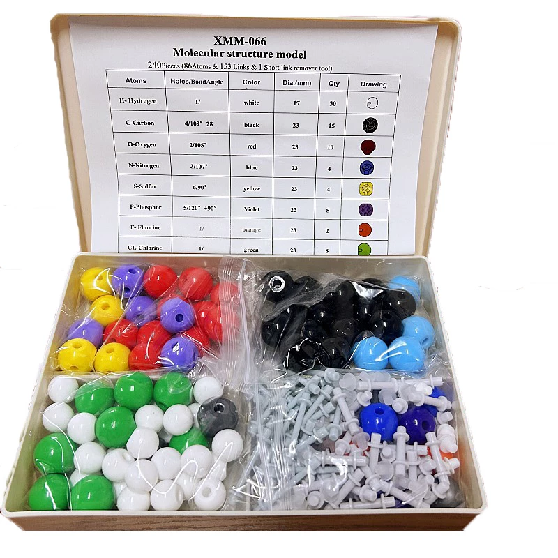 Этот набор моделей органической химии включает 239 деталей, включая 86 атомов и 153 связи, что позволяет создавать самые разные молекулы. В комплект входят: