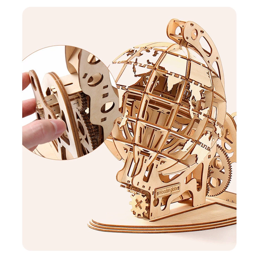 Деревянные конструкторы — интересный подвид пазлов, который позволяет создавать модели транспортных средств, архитектурных сооружений, животных и т.п. Если вы или ваш ребенок еще не знакомы с упомянутыми конструкторами, то самое время восполнить этот пробел. Перед вами увлекательный игровой набор, который подойдет и мальчикам, и девочкам, и также будет интересен взрослым. Конструктор, состоящий из 125 деталей, предназначен для создания модели глобуса. Он станет незаменимым помощником ребенка в познании окружающего мира. Готовая модель вращается вокруг оси при помощи сложного механизма, состоящего из множества шестеренок. Собрав глобус, можно легко распознать силуэты материков, а также широту и долготу планеты.