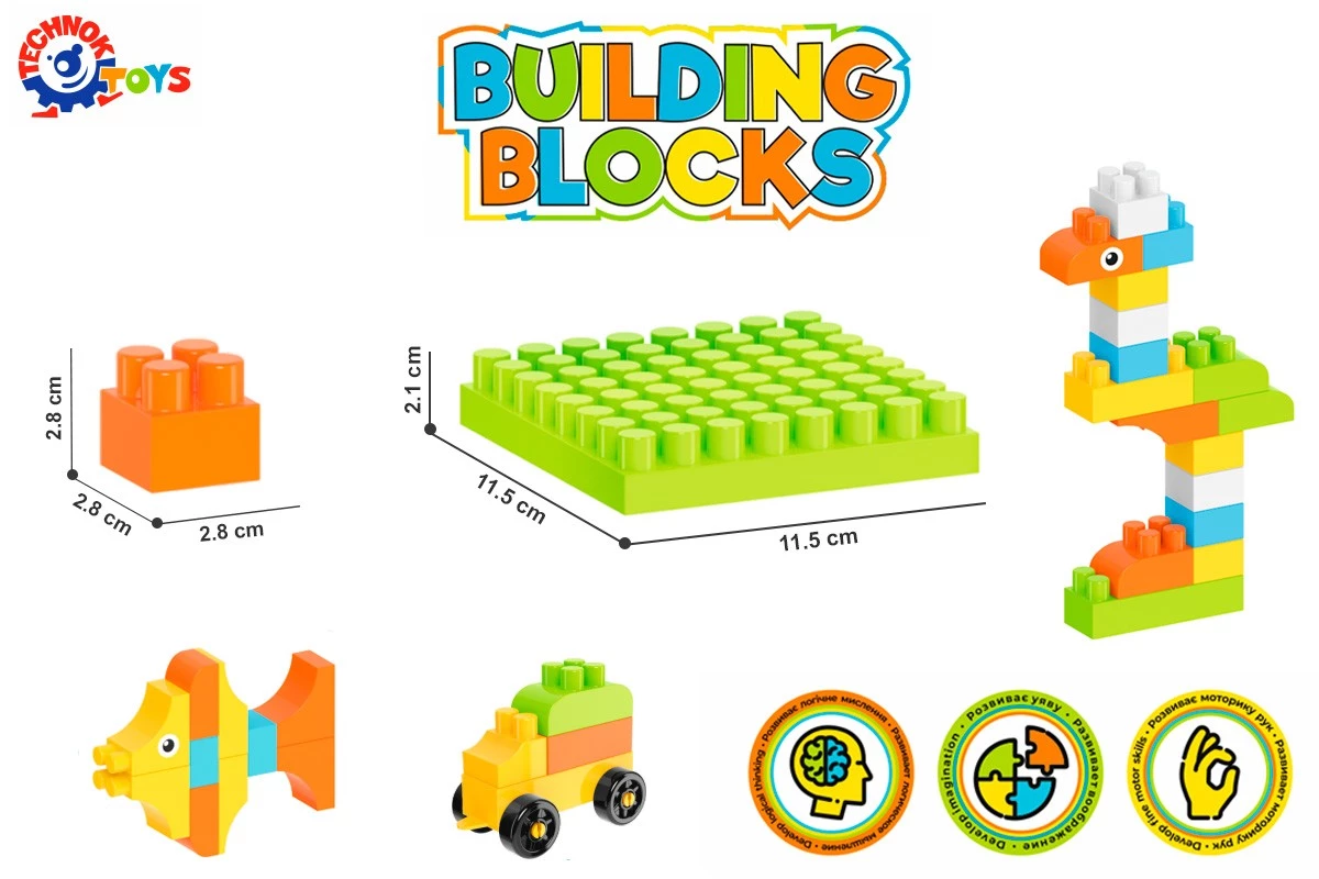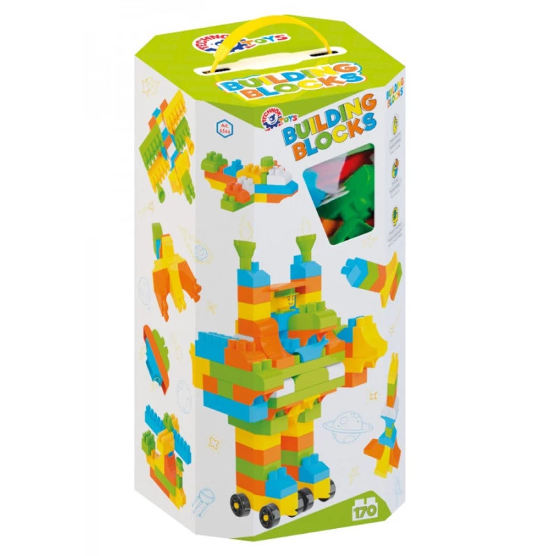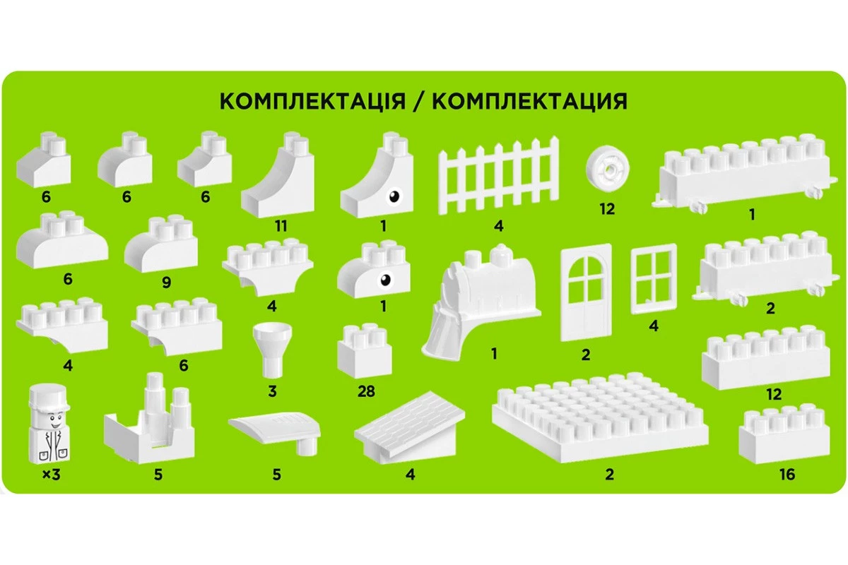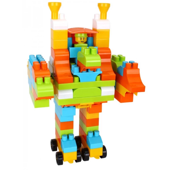 В комплект входит 170 элементов, выполненных в ярких цветах. В наборе есть блоки разных размеров, окна, дверцы и заборчики для возведения различных построек. А благодаря платформе с колесами можно сконструировать авто, поезд или самолет. Кроме того, данная платформа пригодится при конструировании роботов.