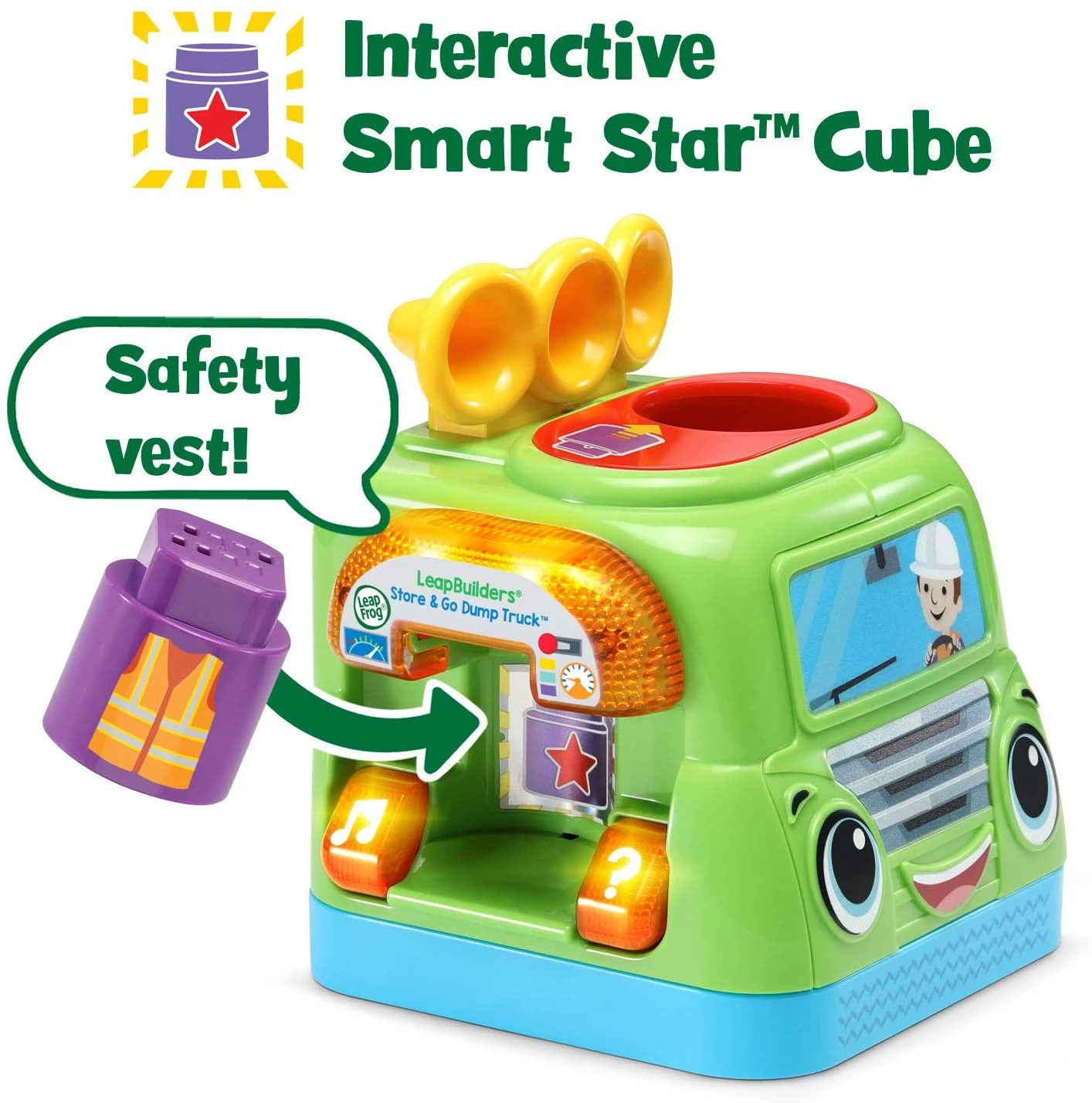 Вставьте 10 двусторонних обучающих блоков в интерактивный куб Smart Star, чтобы услышать более 110 звуков и фраз, которые вводят словарный запас и формы. Бросьте блоки по желобу в ведро, чтобы вызвать крутые звуковые эффекты. Нажмите кнопку вопроса, чтобы услышать запросы на поиск определенного блока; нажмите кнопку музыки, чтобы воспроизвести песни.