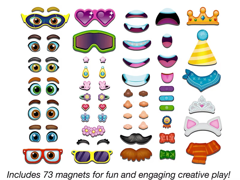 Магнитный конструктор от торговой марки Lakeshore содержит все для создания крутого образа — от солнцезащитных очков и носов до сережек и усов. Все это обеспечит маленьким стилистам часы увлекательной творческой игры! Просто комбинируйте черты лица и магниты-аксессуары на шаблонах, чтобы получить массу комбинаций лиц. В комплект входит двусторонняя магнитная доска, 8 уникальных лиц на четырех двусторонних шаблонах и 73 магнита.