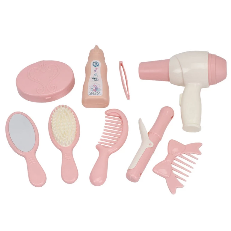В комплект входит набор из девяти аксессуаров для полноценной игры: расческа, щетка, ручное зеркальце, пинцет, заколка-гребешок, плойка, пудреница, фен и тюбик крема. Эти реалистичные предметы стимулируют воображение и помогают ребенку имитировать процесс ухода за собой.